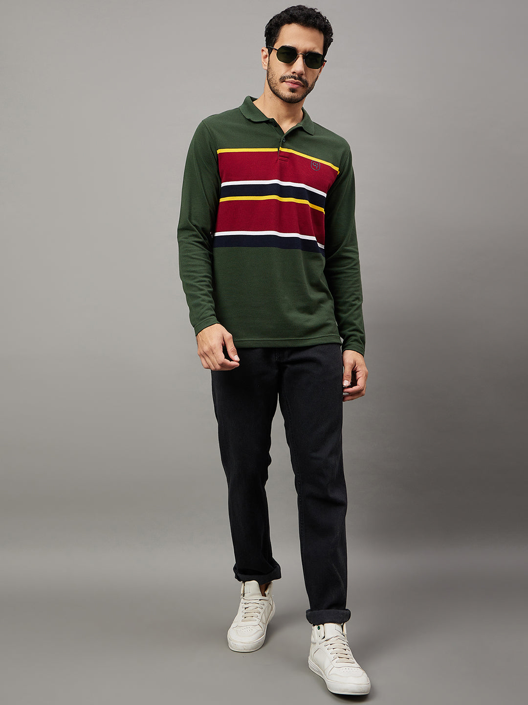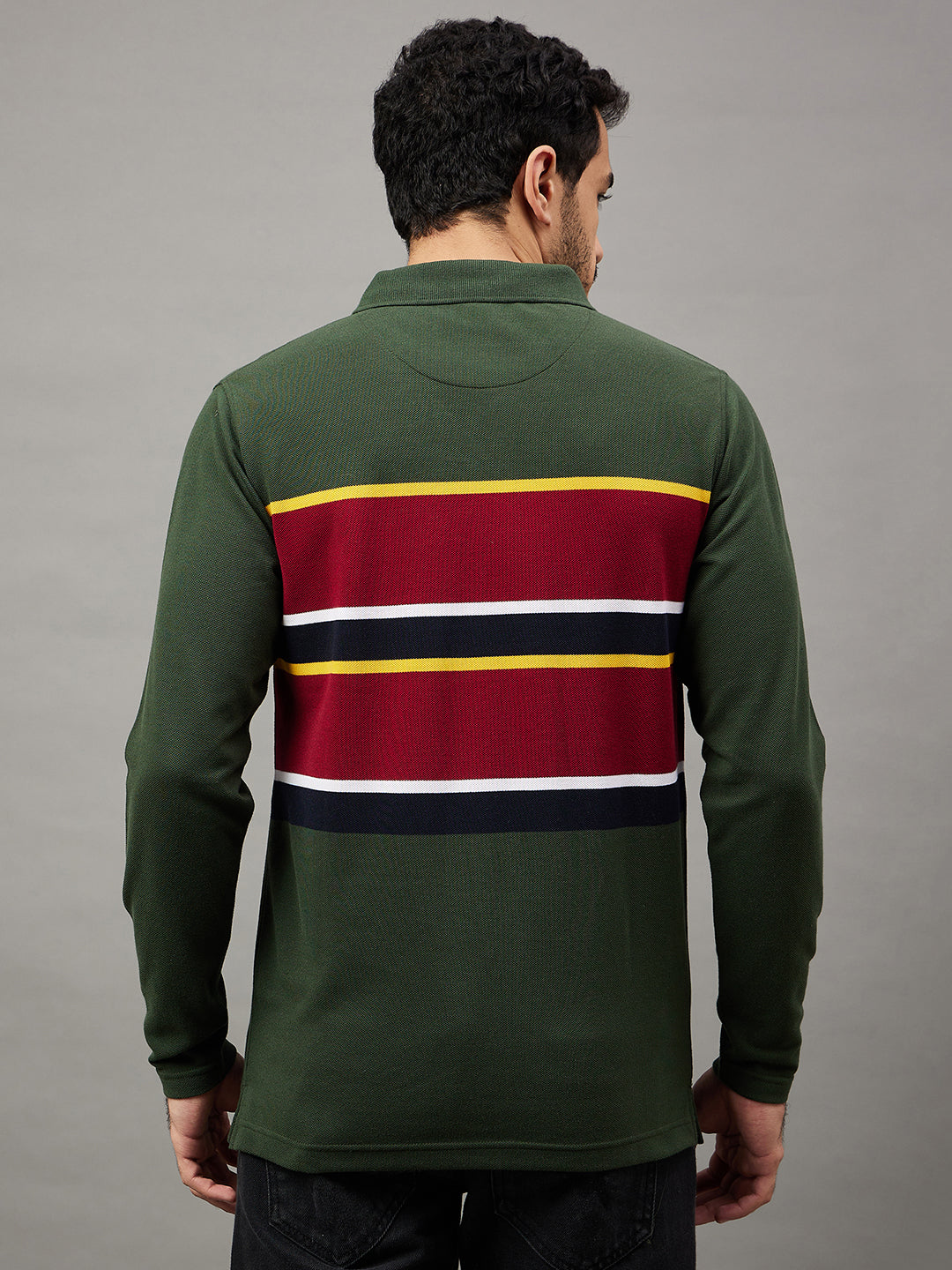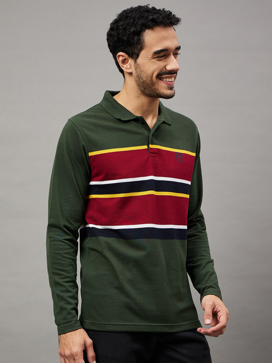 Club York Men Bottle Green Striped Full Sleeve Polo Neck T Shirt 6269
