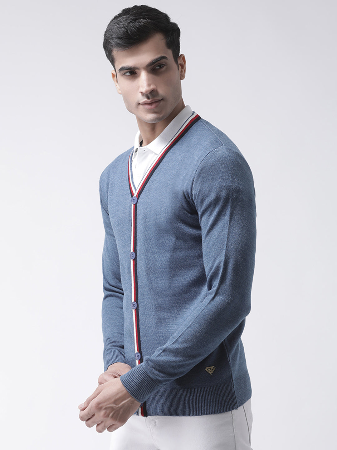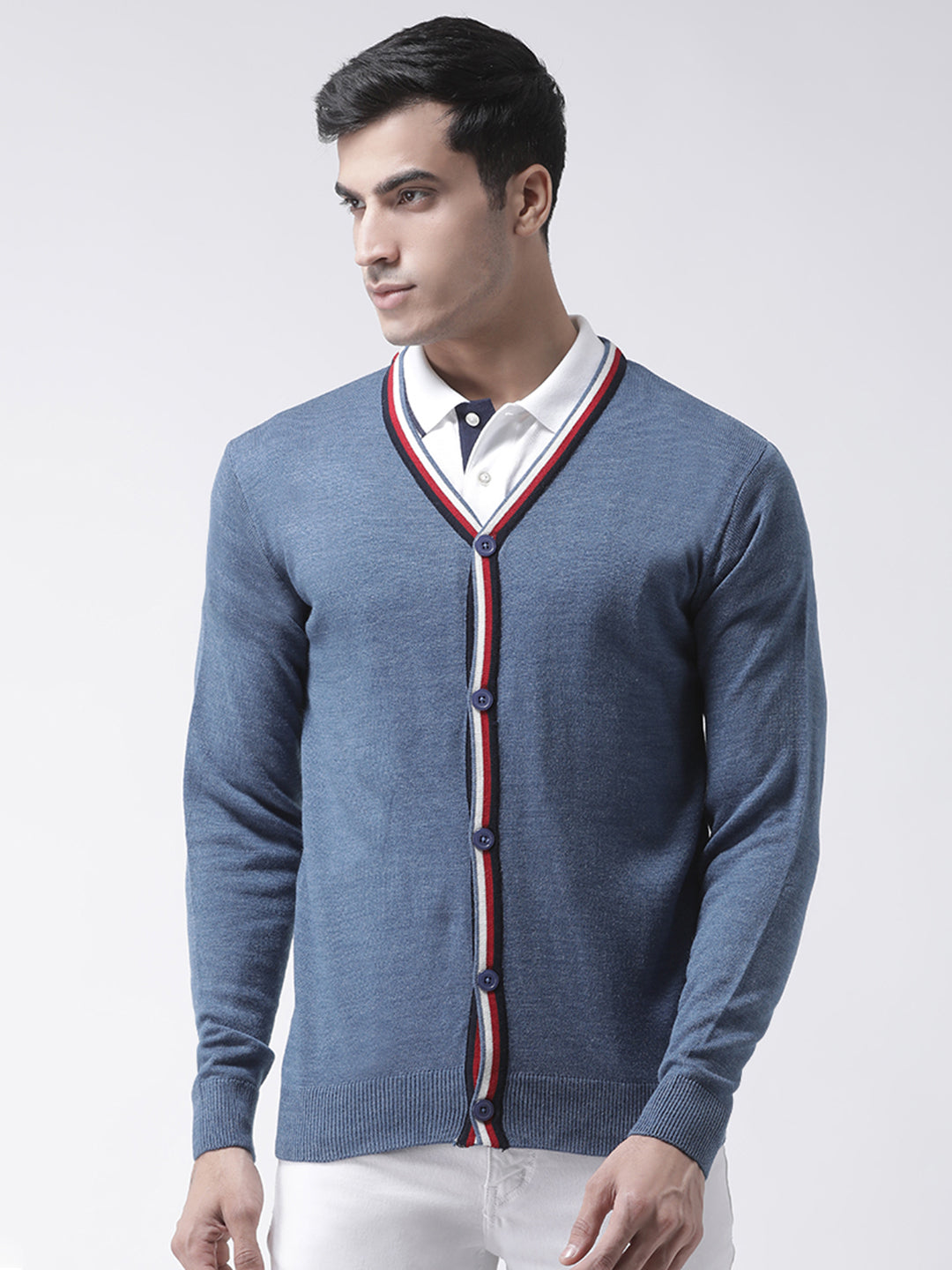 Club York Mens Blue Full Sleeve Solid V Neck Front Open With Button Sweater 6788