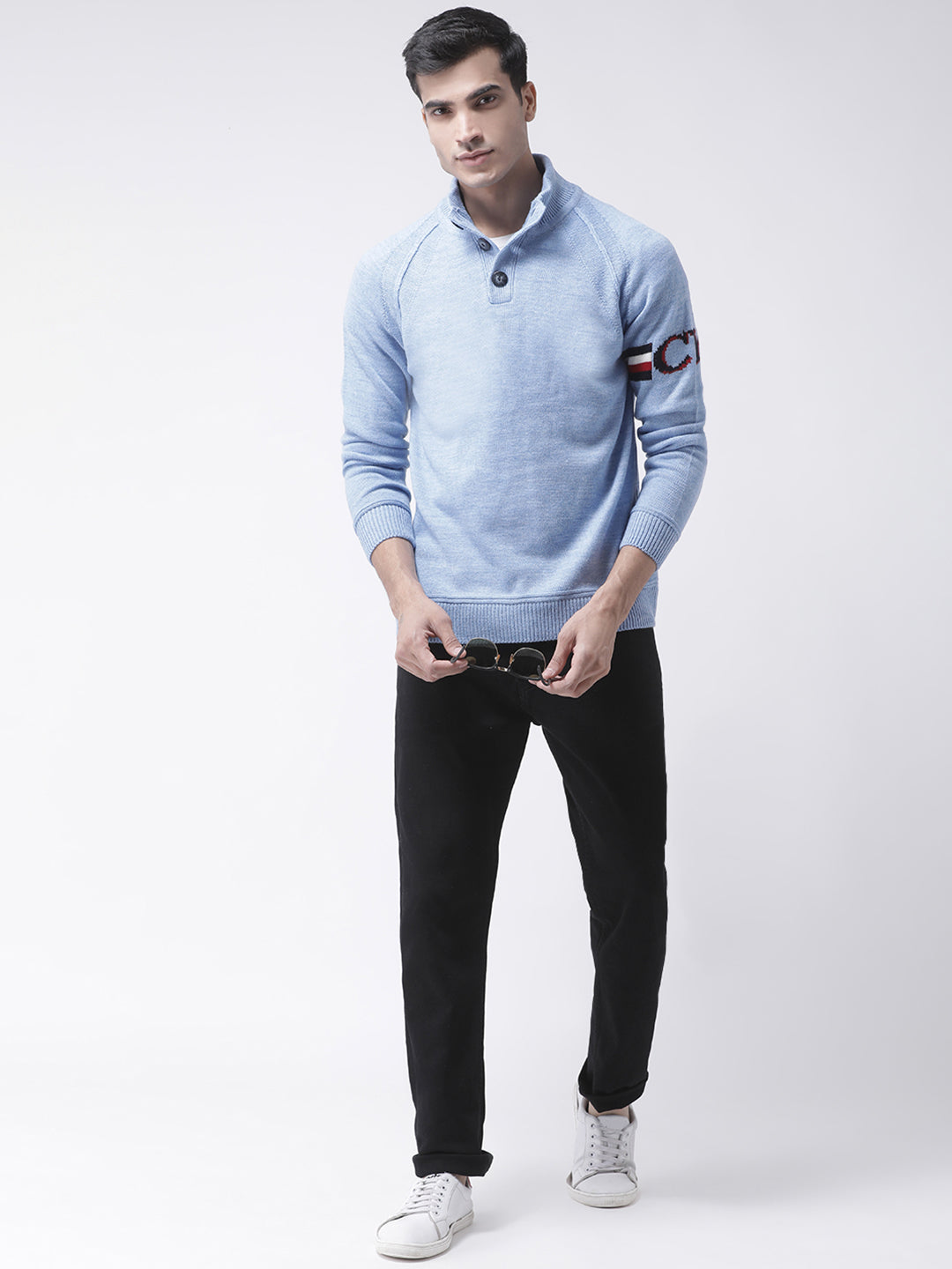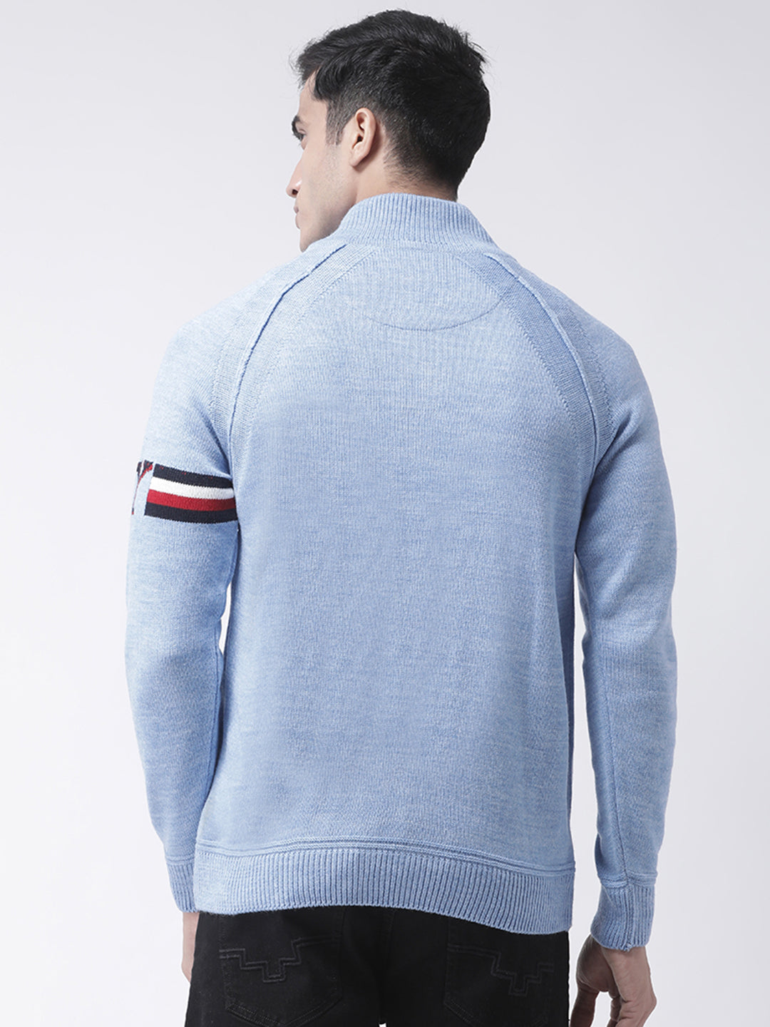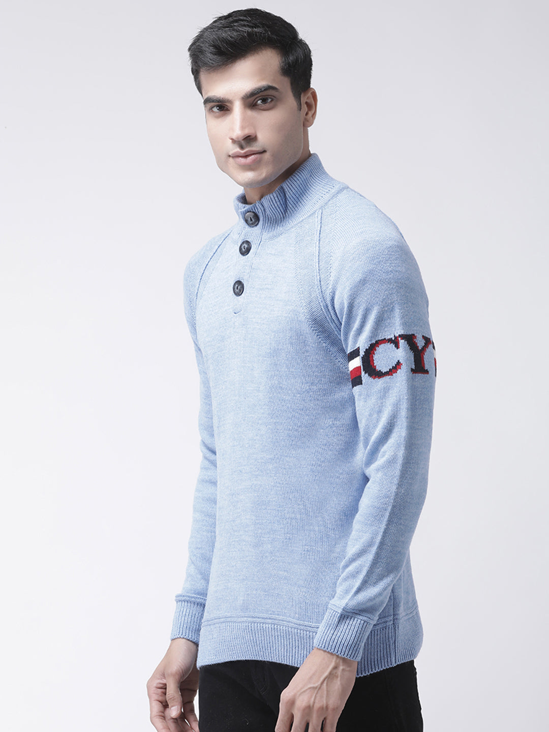 Club York Mens Blue Raglan Sleeve Self Design High Neck With Front Button Sweater 8542