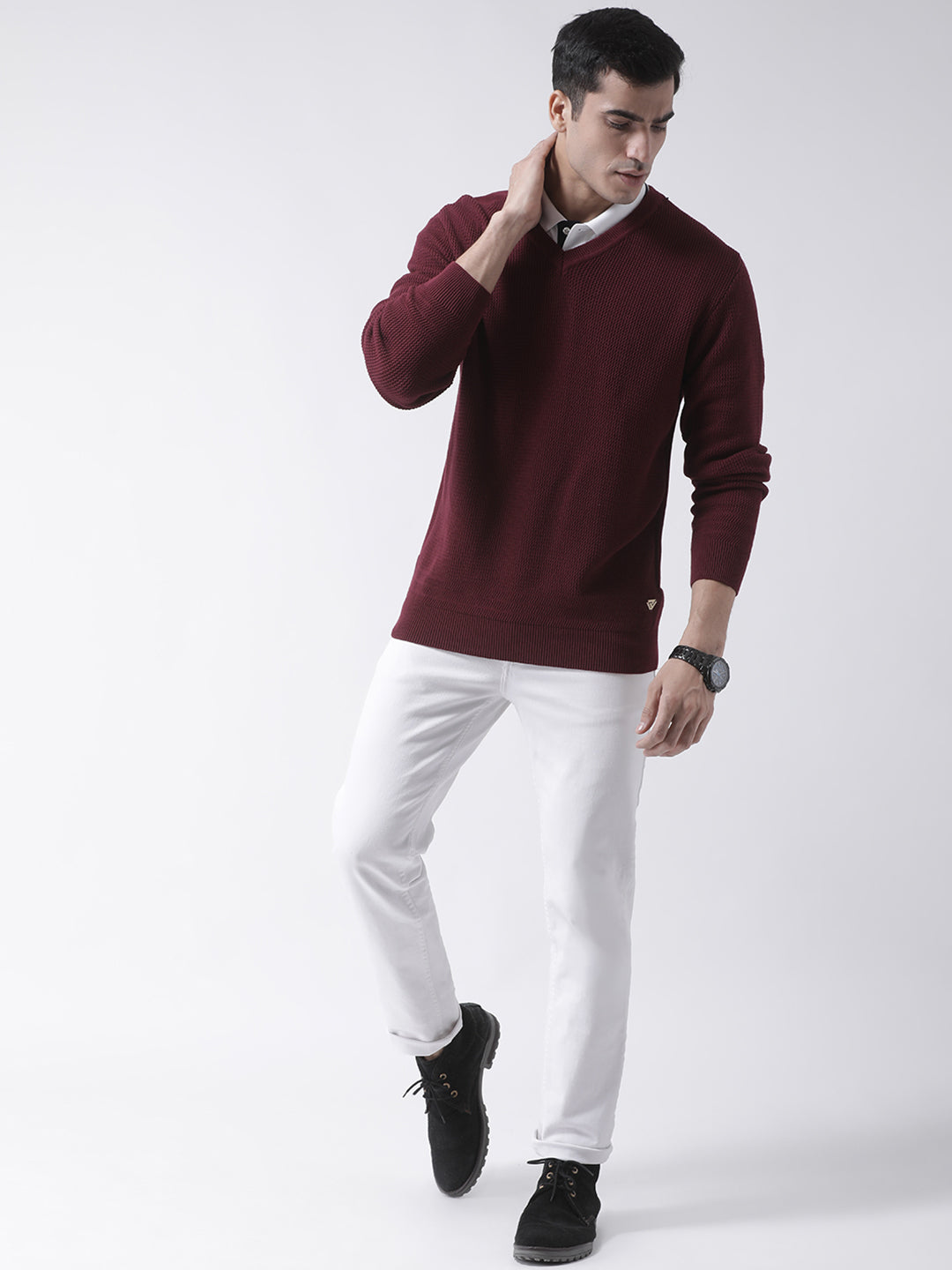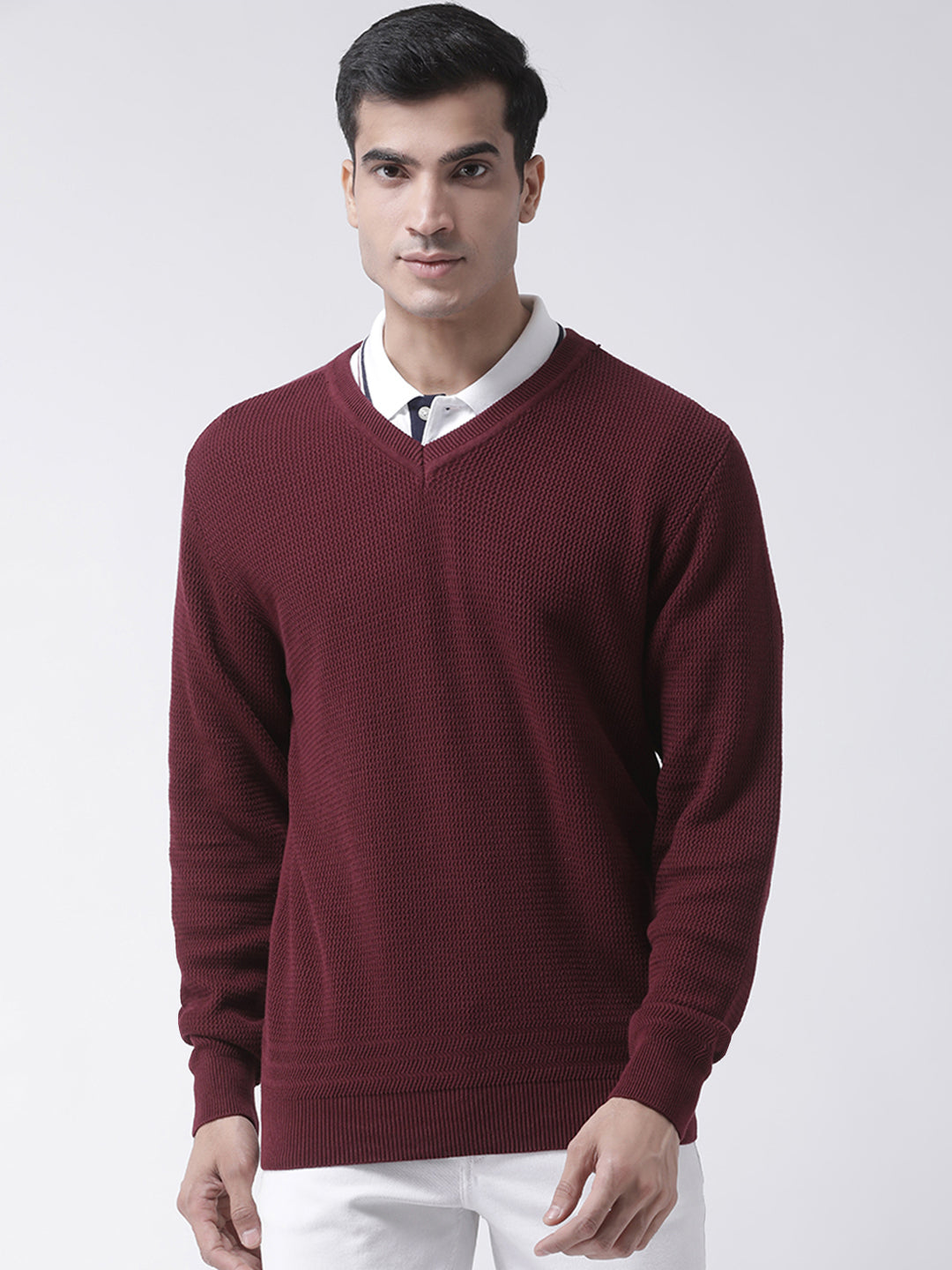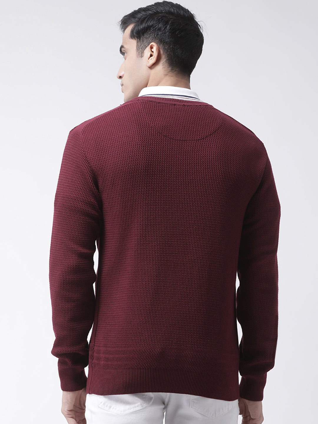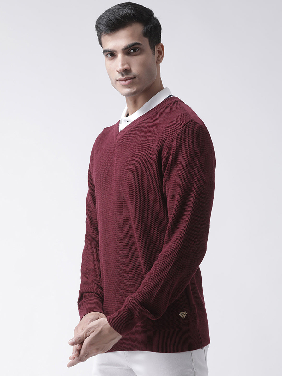 Club York Mens Maroon Full Sleeve Self Design V Neck Sweater 2588
