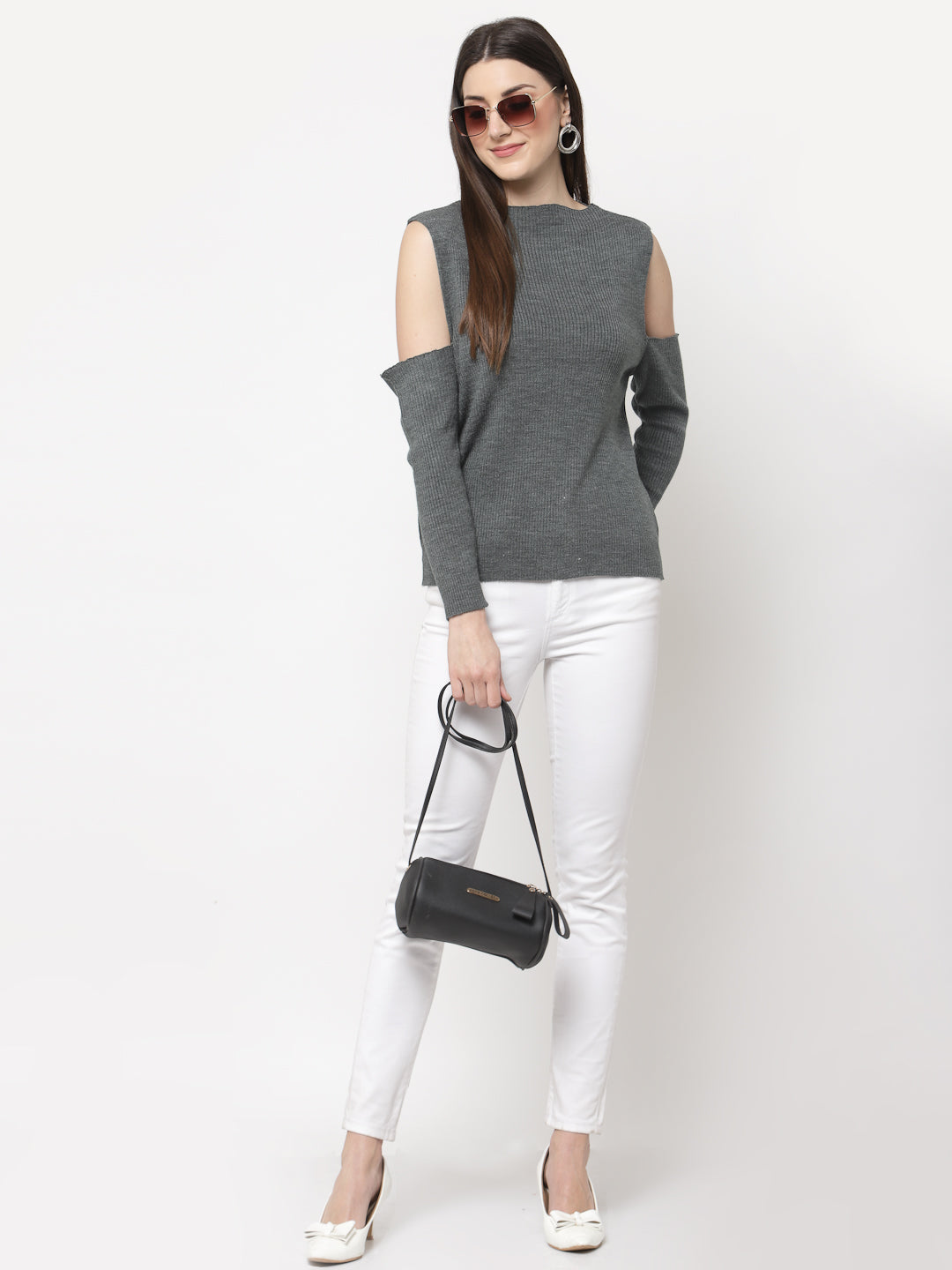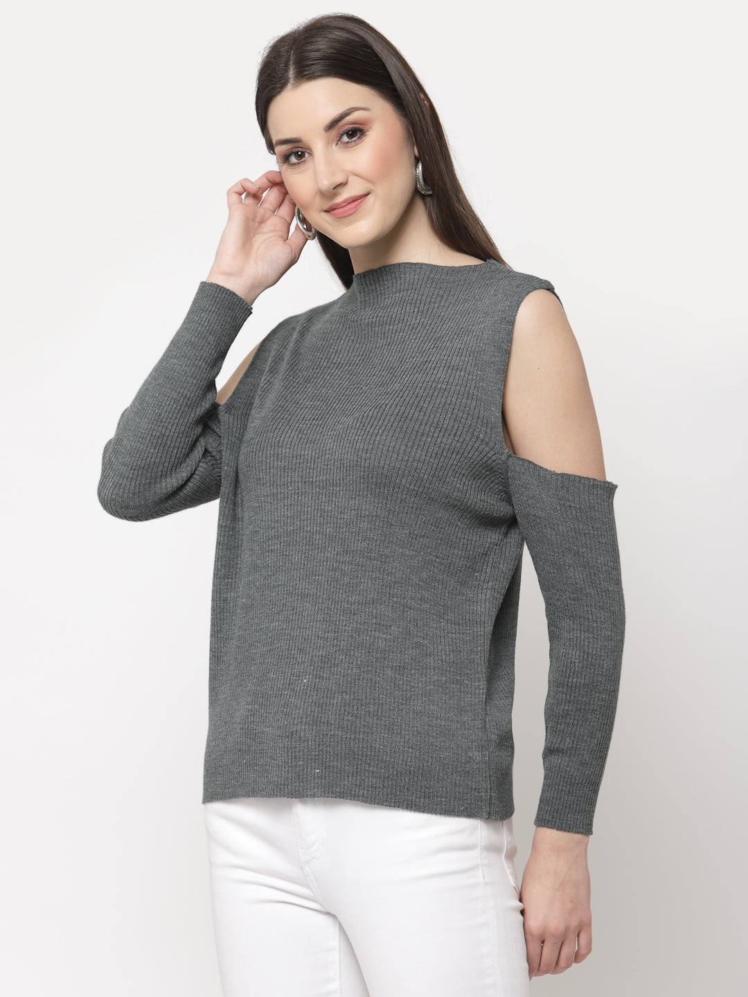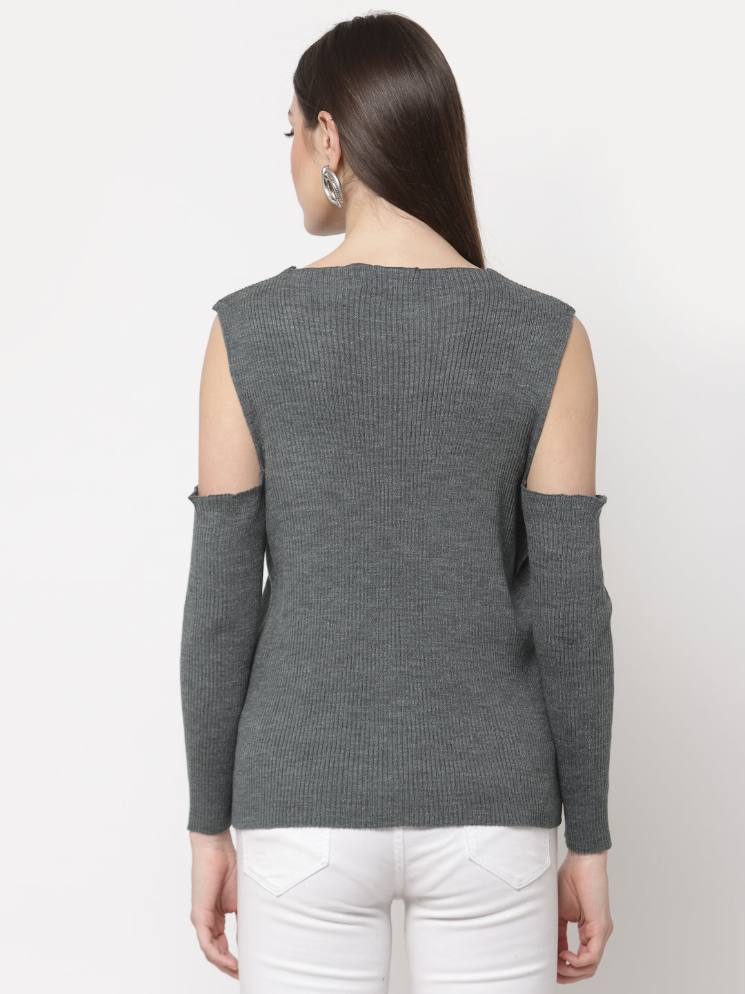 Club York Women Grey Ribbed Cold Shoulder Sleeves Pullover 2026
