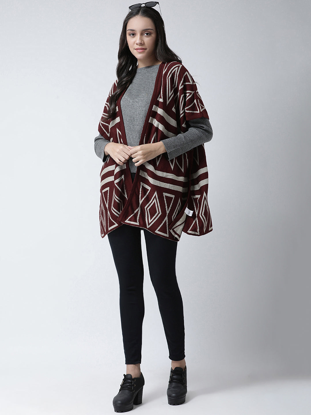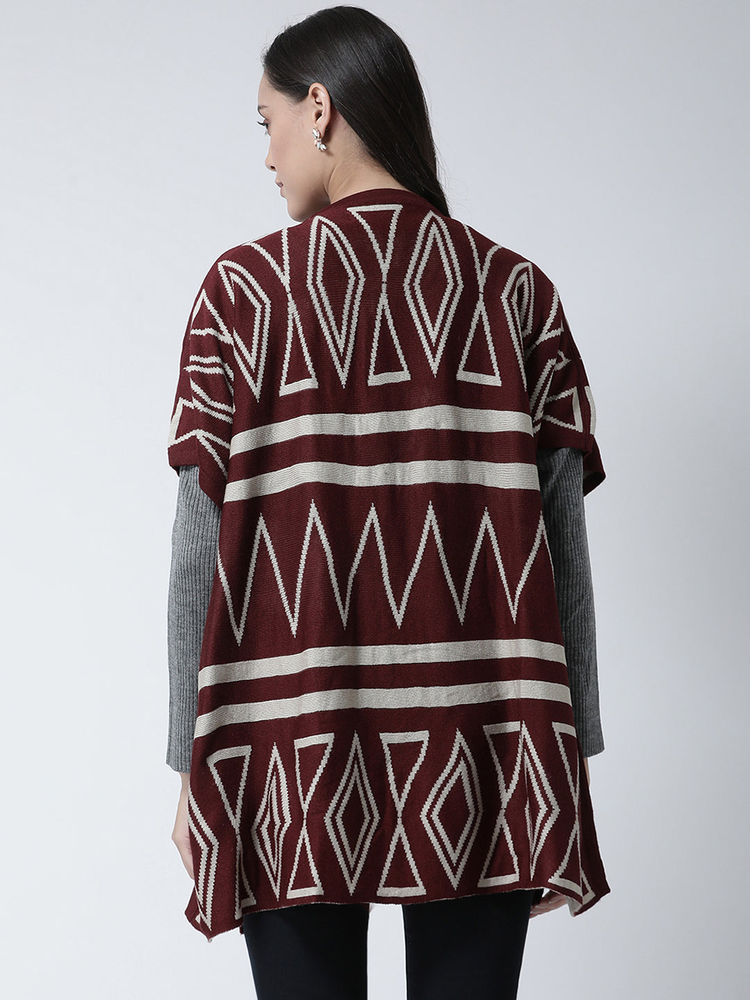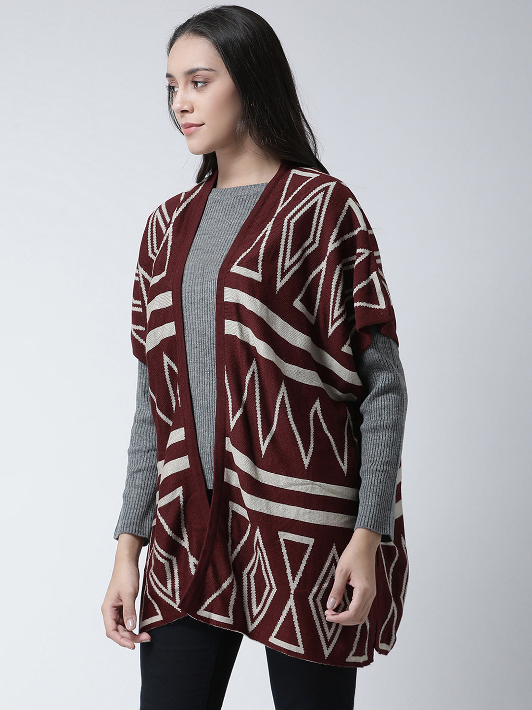 Club York Women Maroon Printed Open Front Acrylic Shrug 7480
