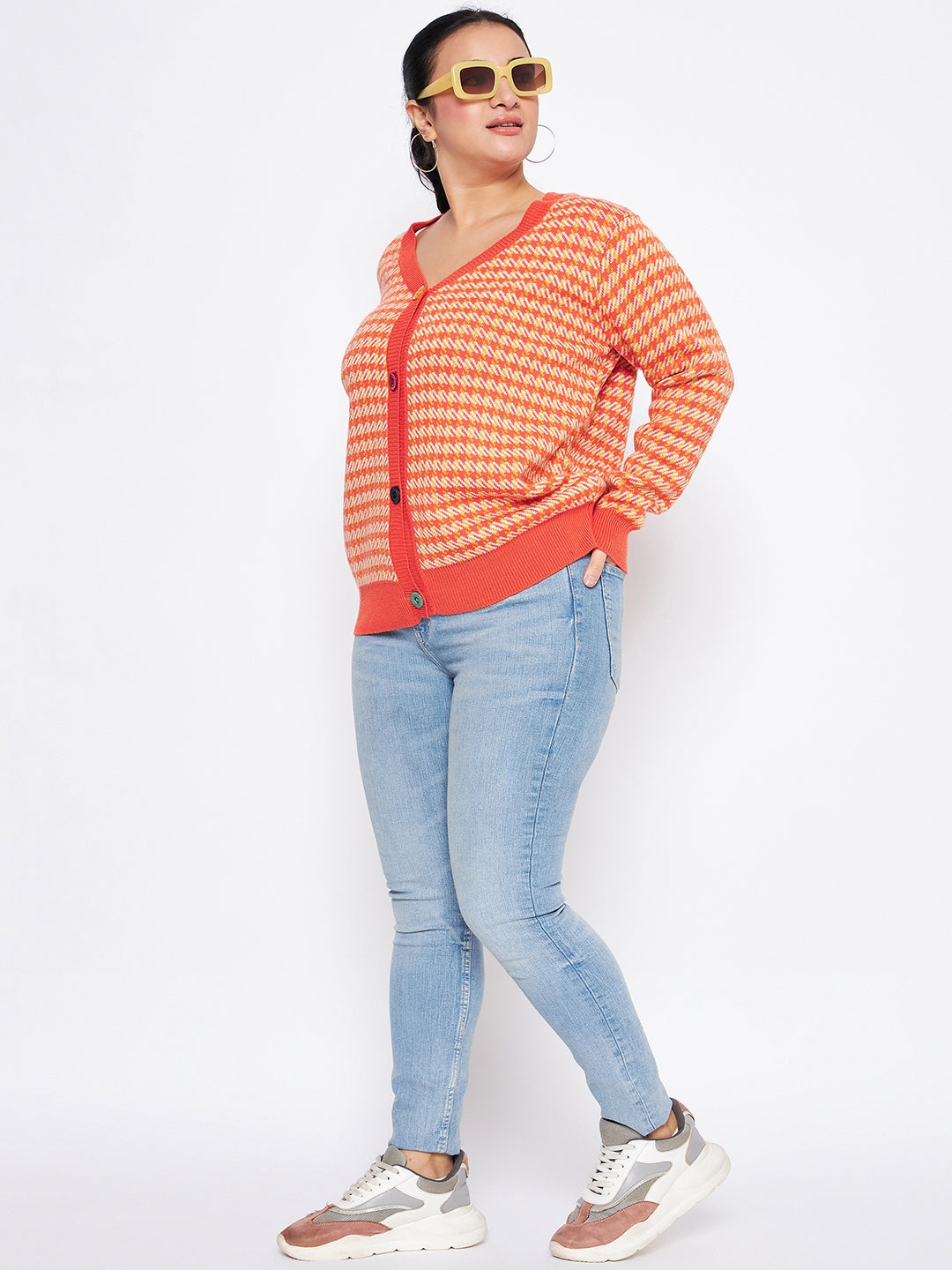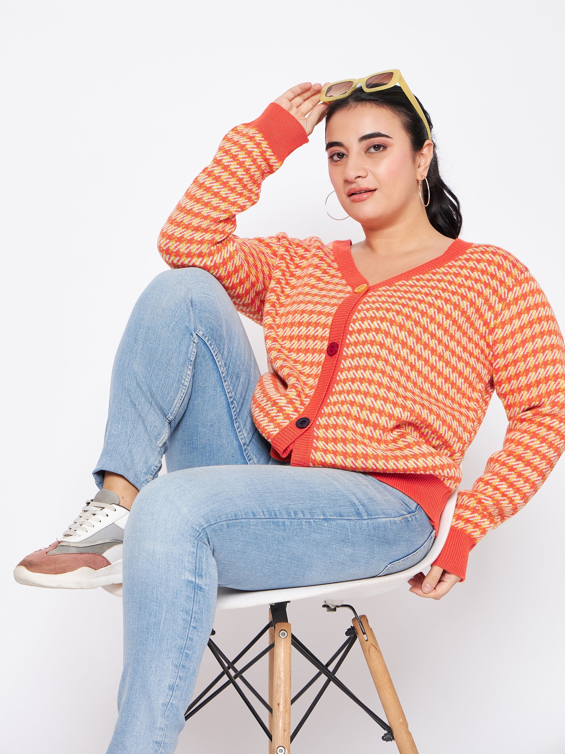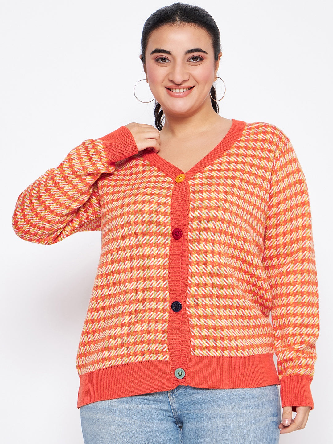 Club York Women Orange V Neck Full Sleeve Checked Cardigan 1283