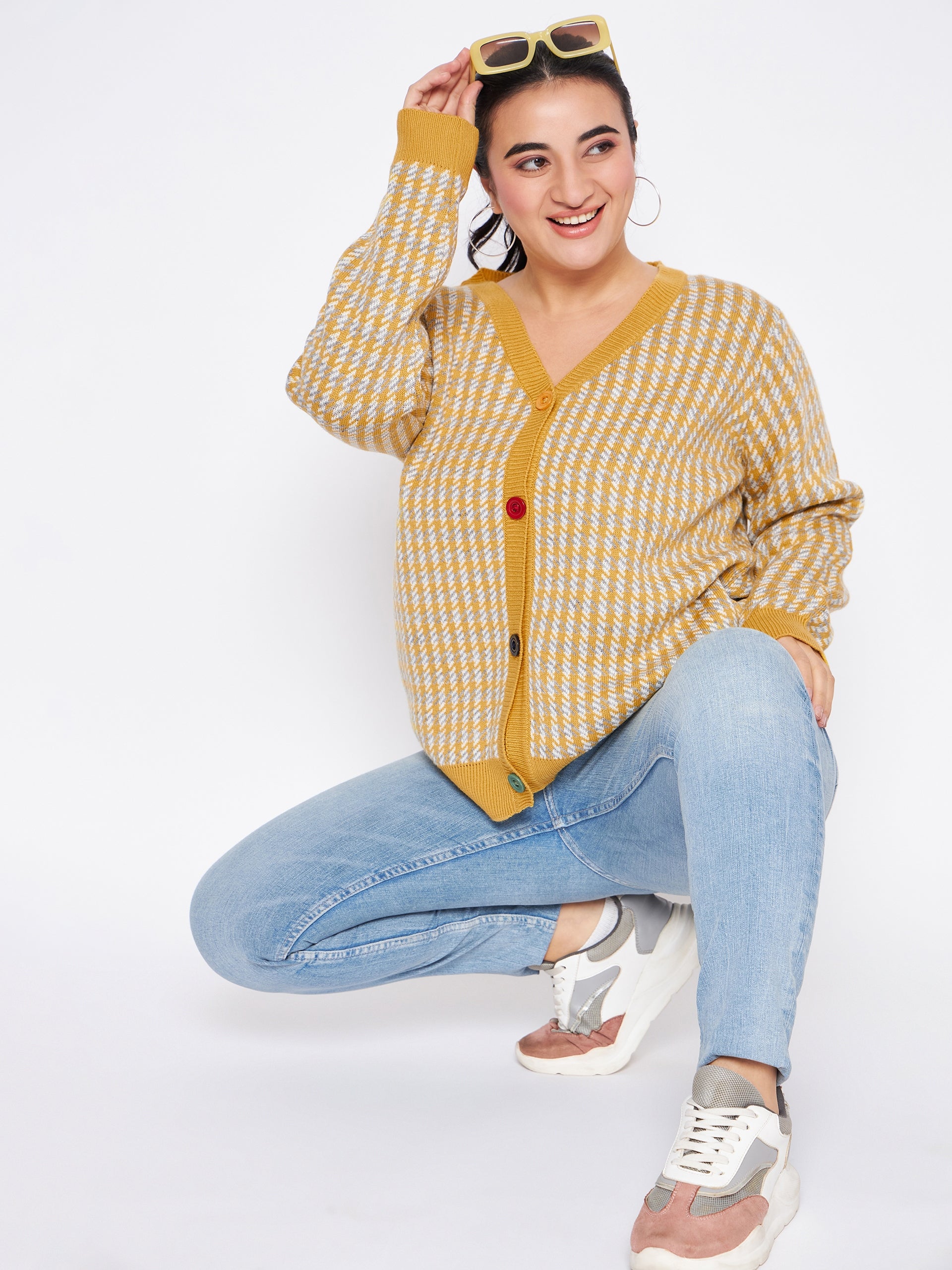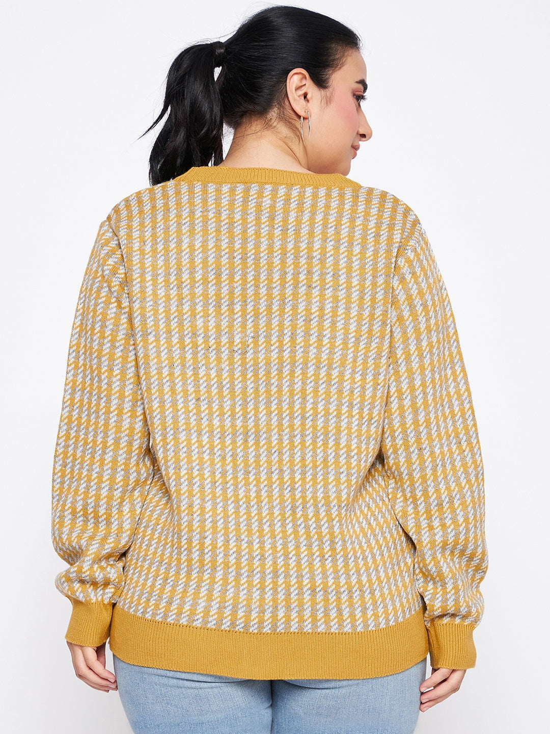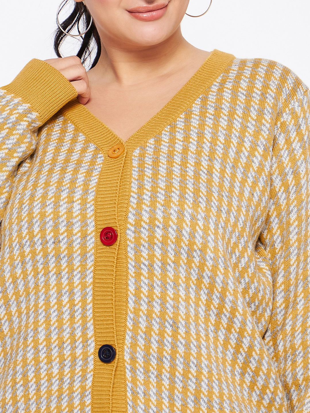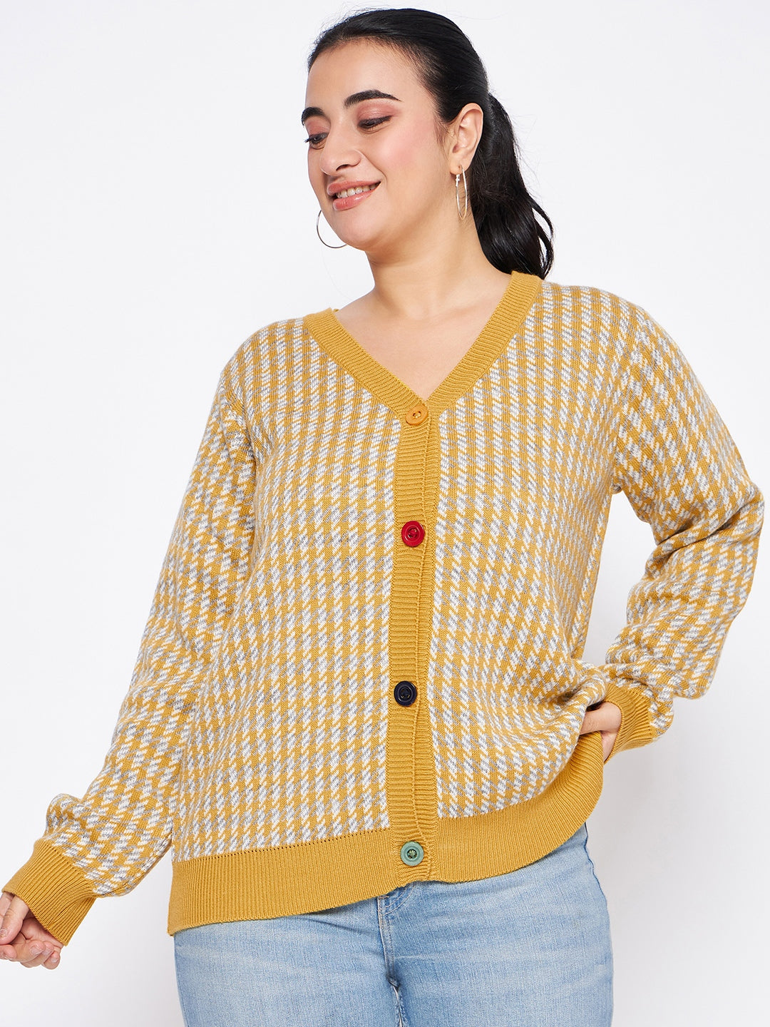 Club York Women Yellow V Neck Full Sleeve Checked Cardigan 7339