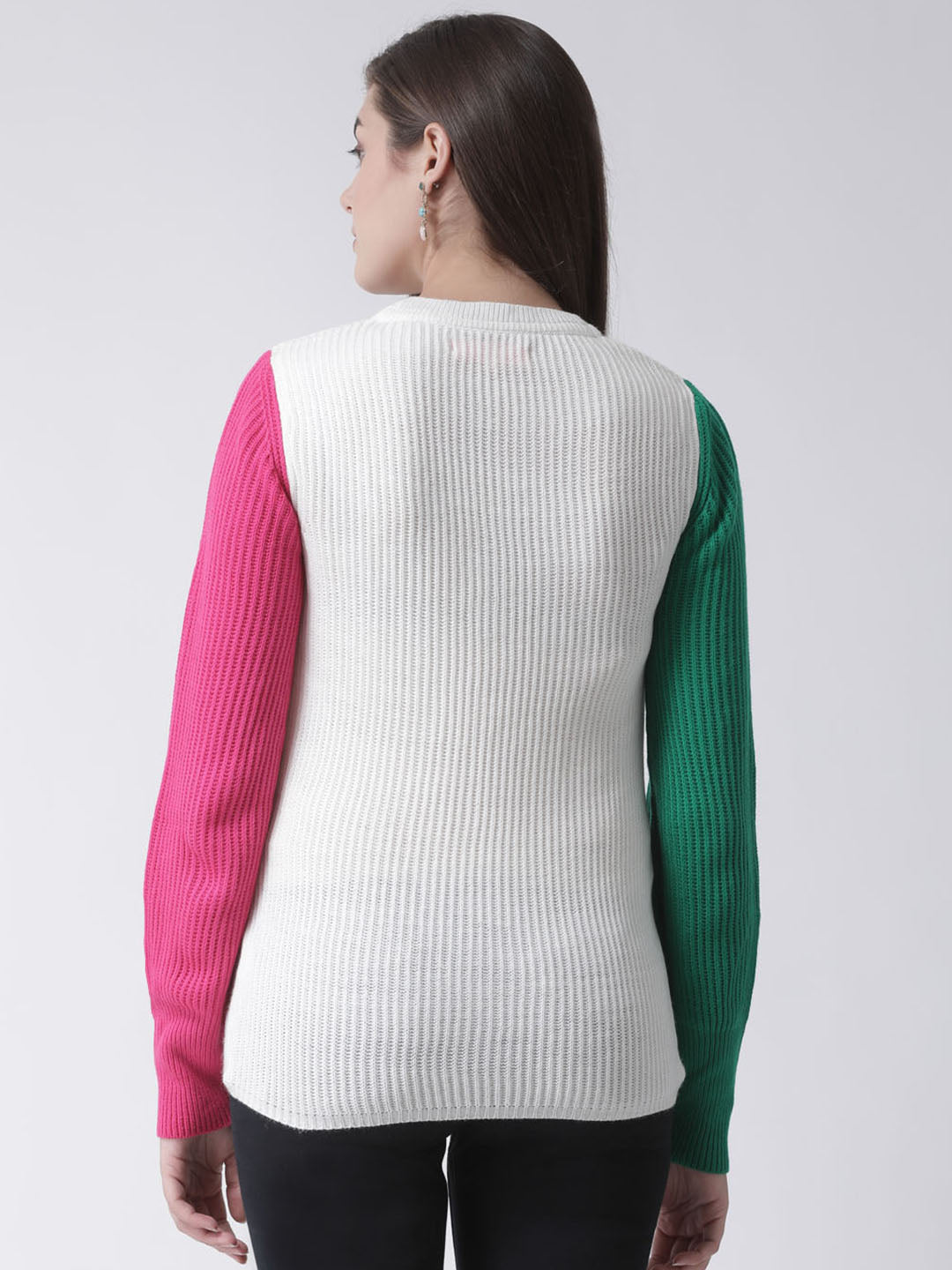 Club York Womens White Full Sleeve Colourblocked Round Neck Sweater 3543