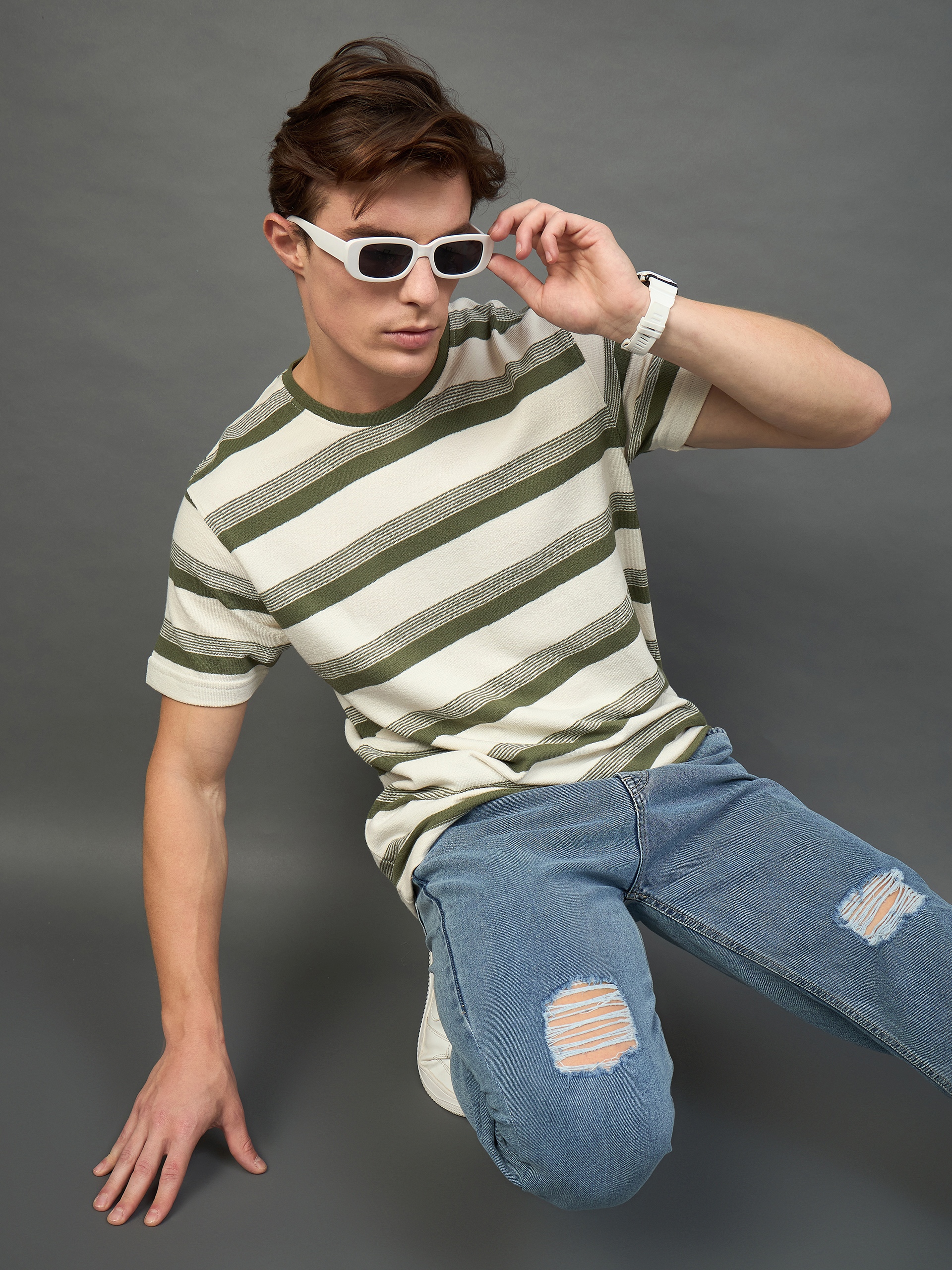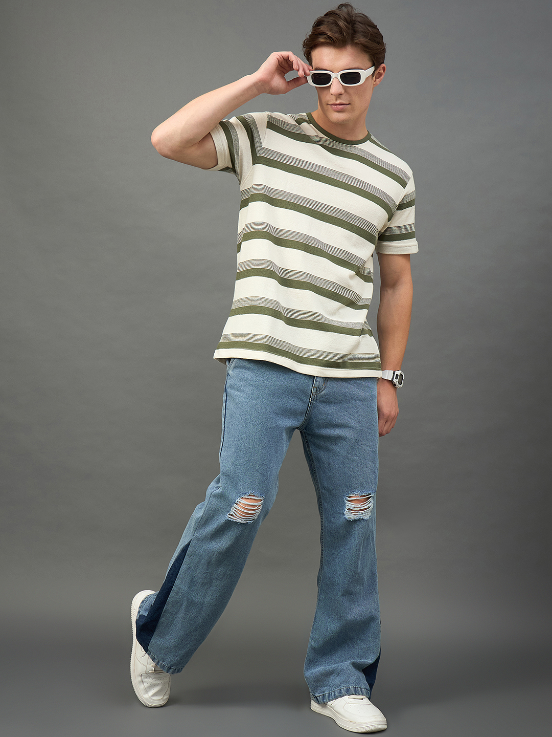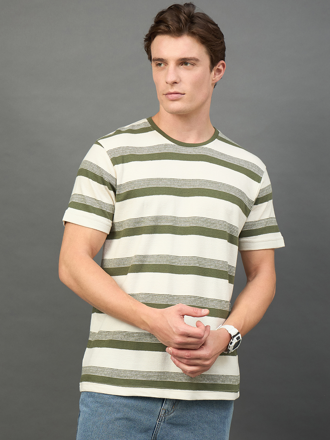 Men Horizontal Striped Green Half Sleeve Round Neck T Shirt