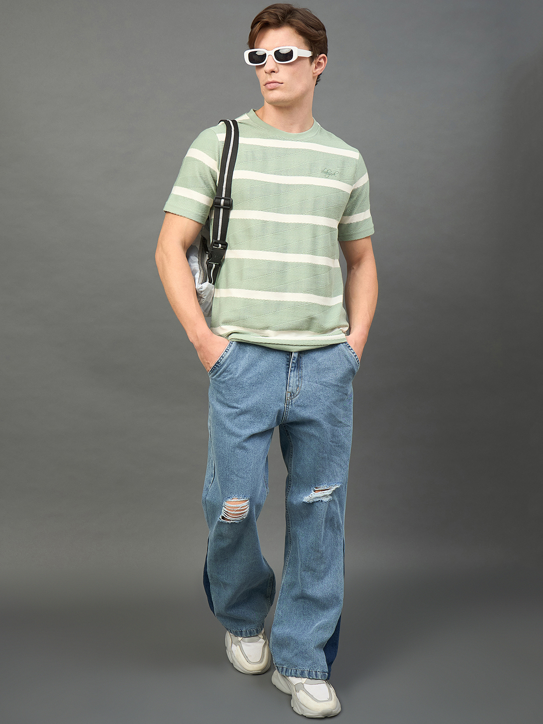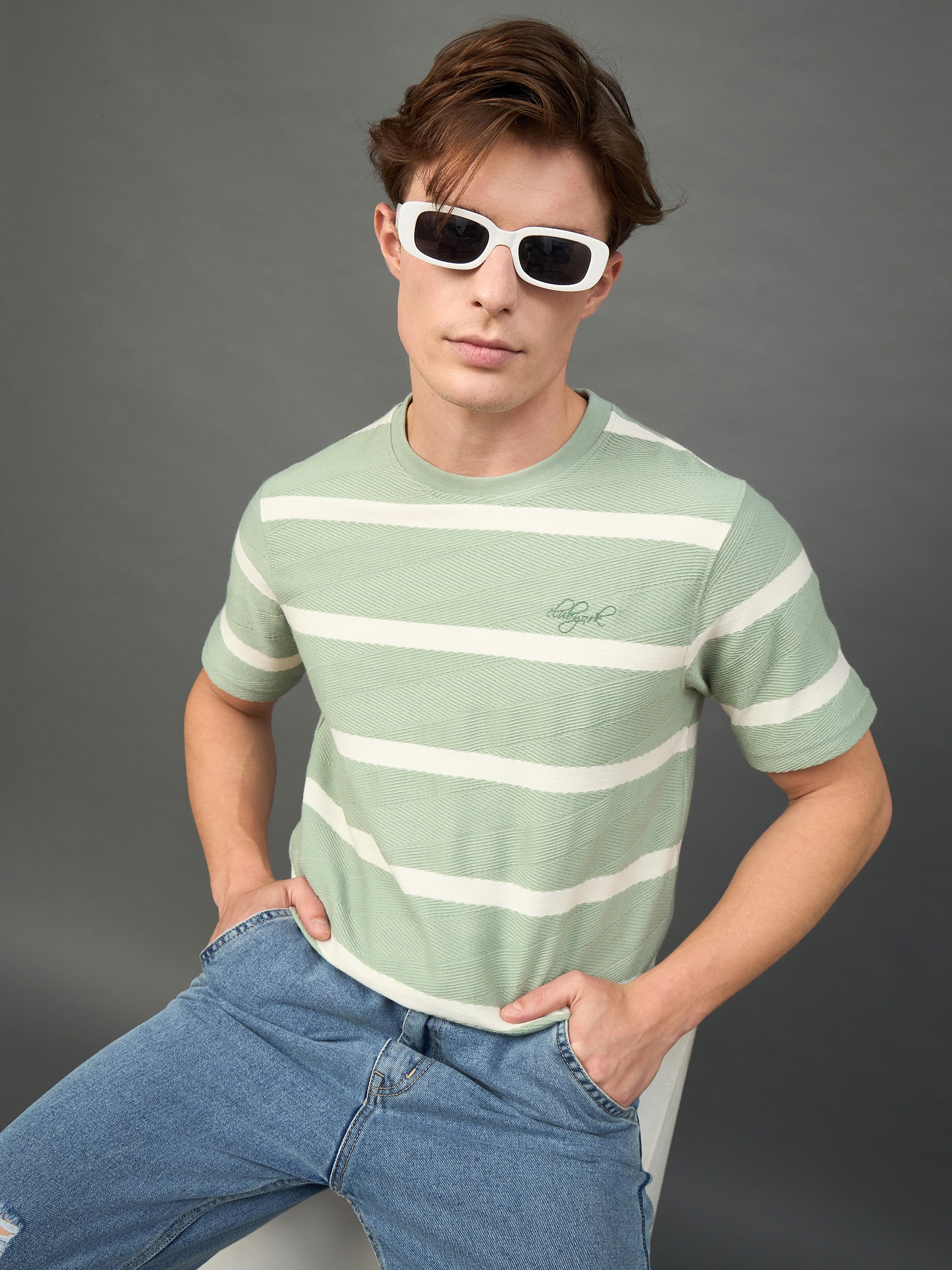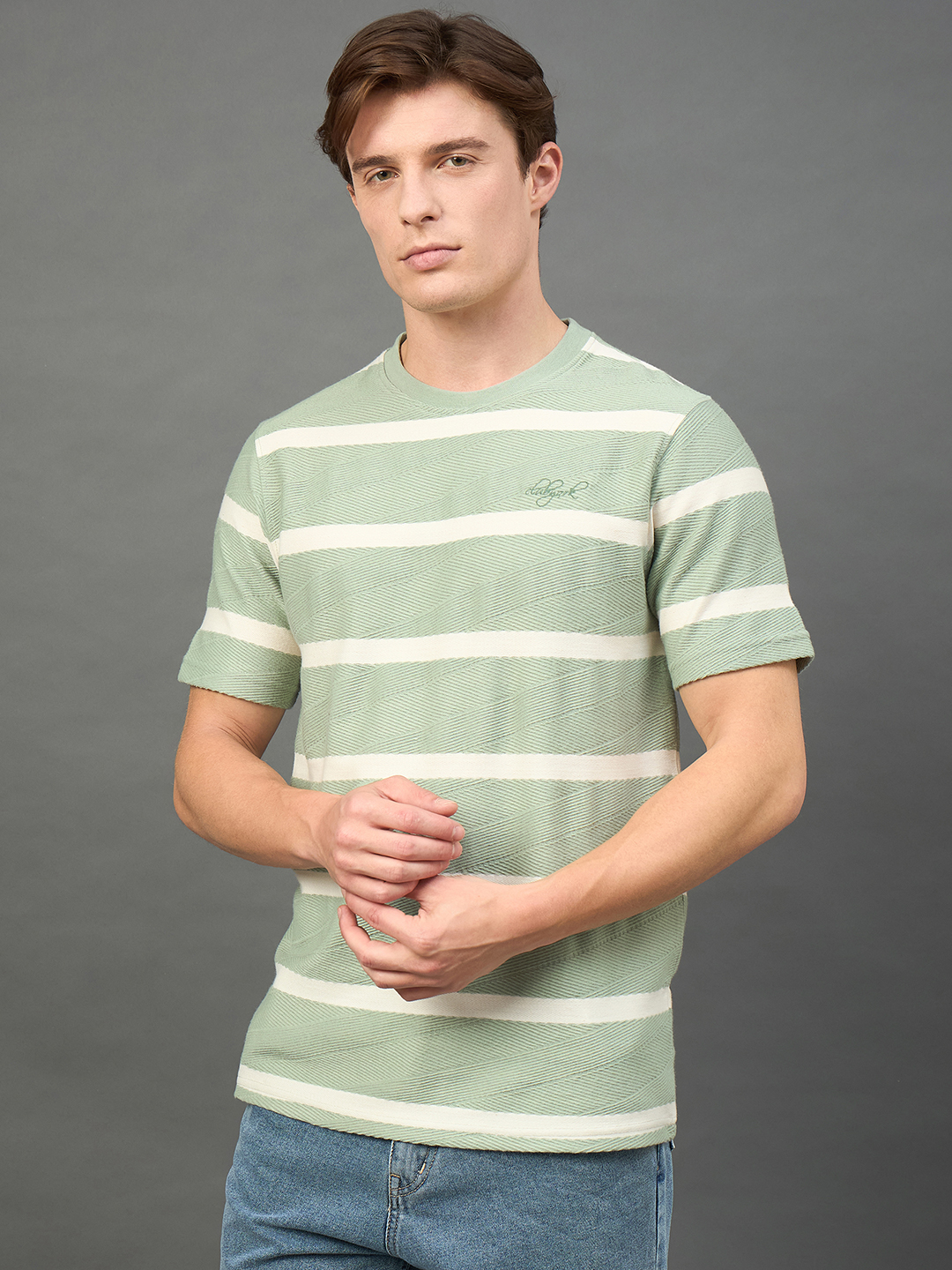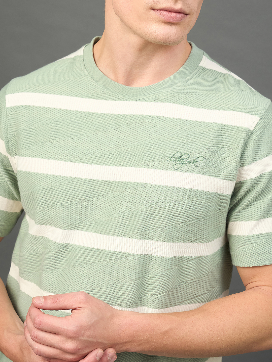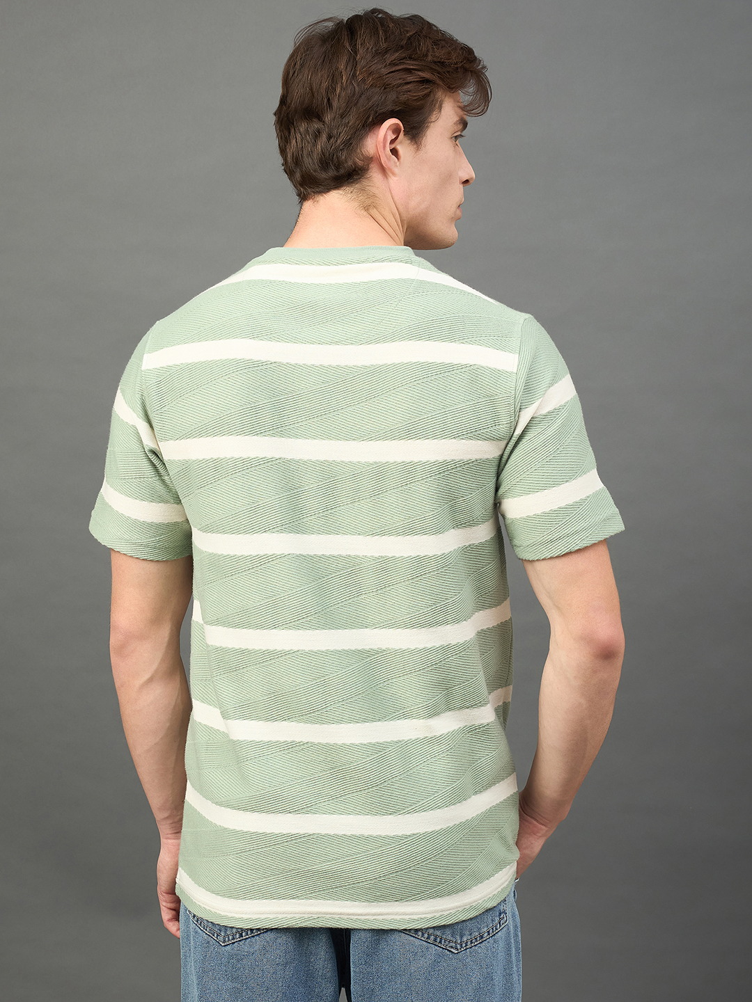 Men Horizontal Striped Light Green Half Sleeve Round Neck T Shirt