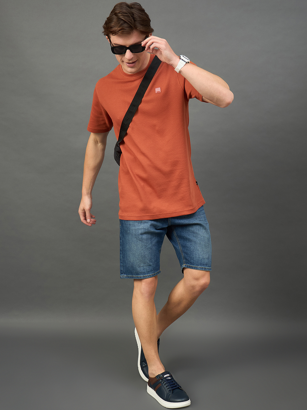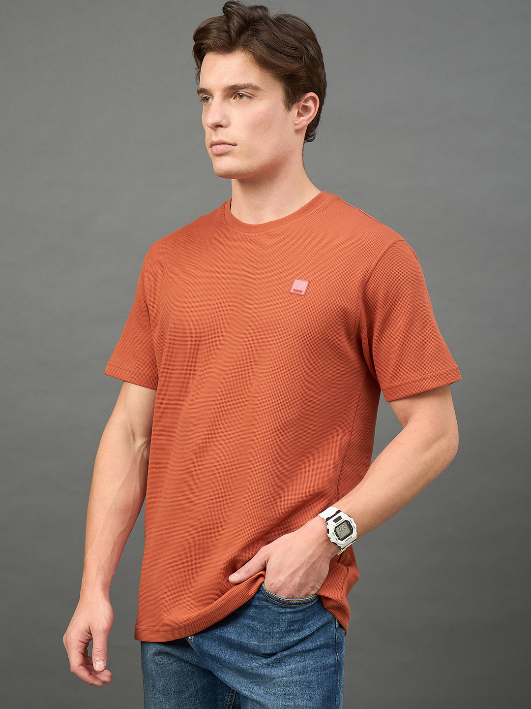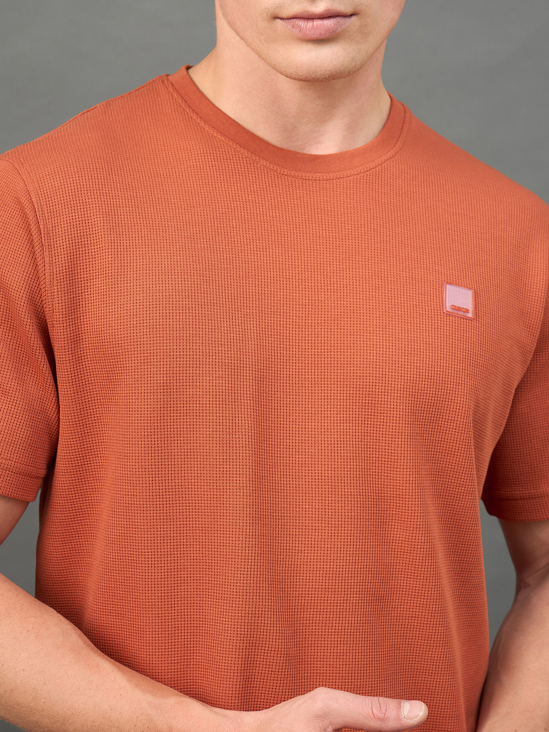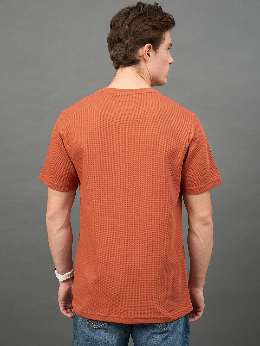Men Self Design Rust Round Neck T Shirt