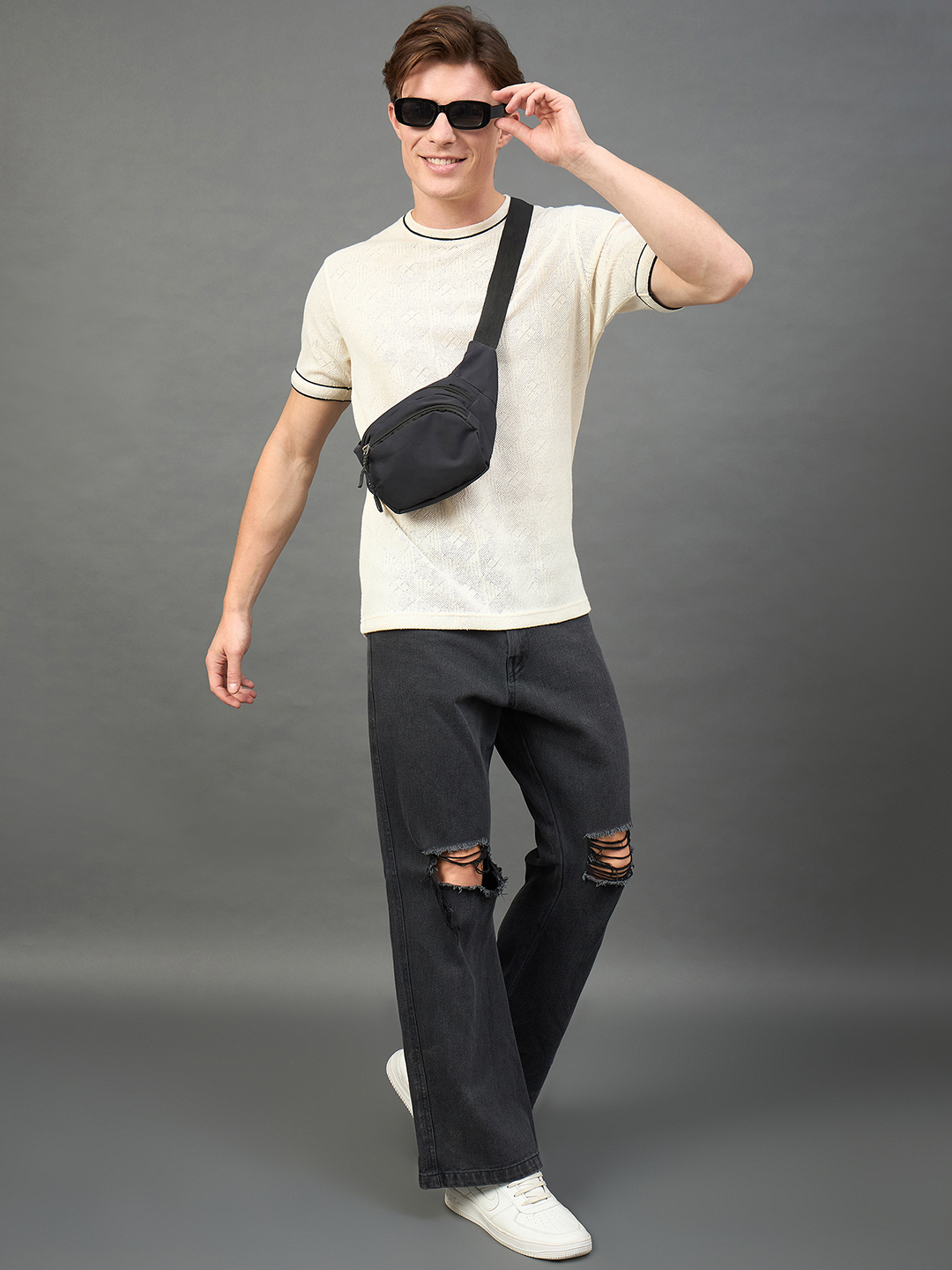 Men Solid Black Bordered Beige Half Sleeve Round Neck T Shirt