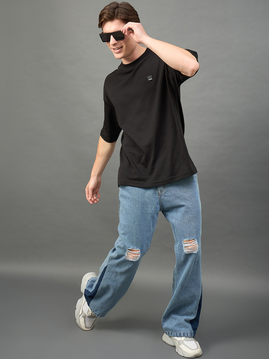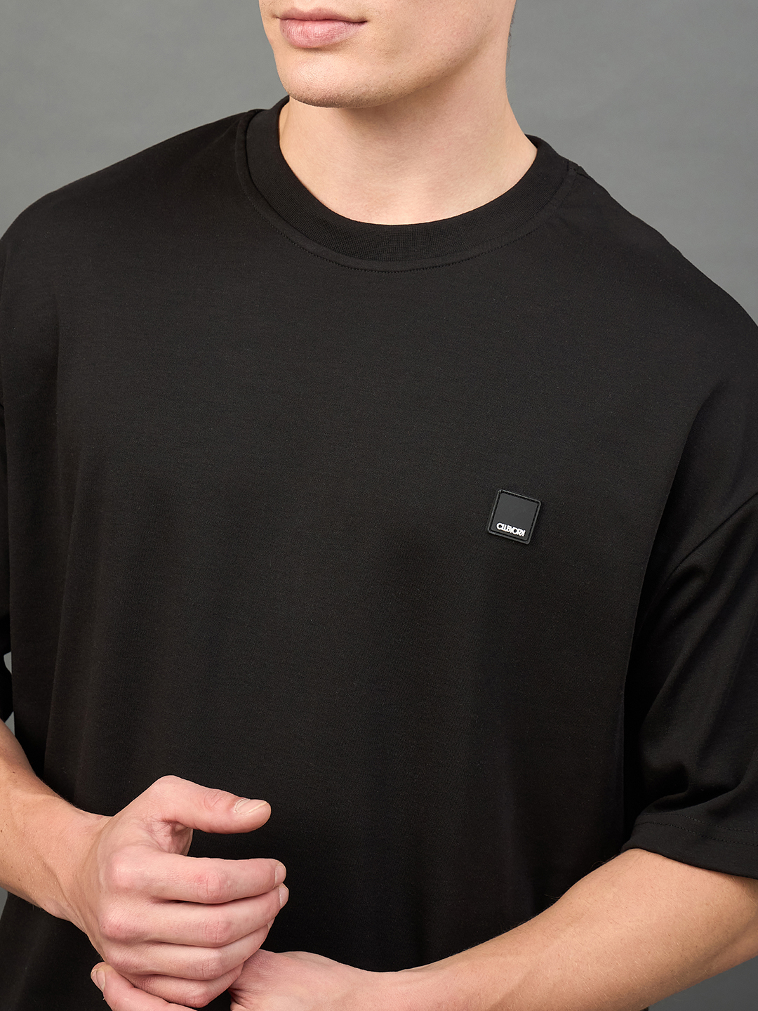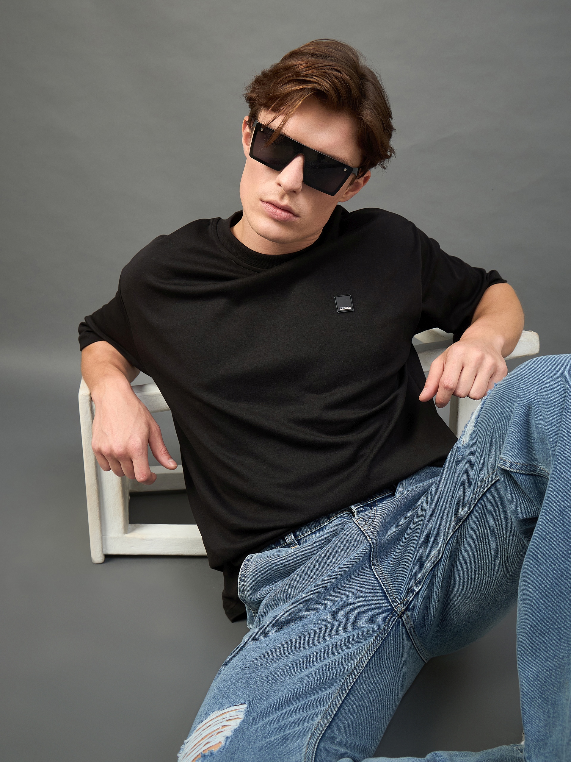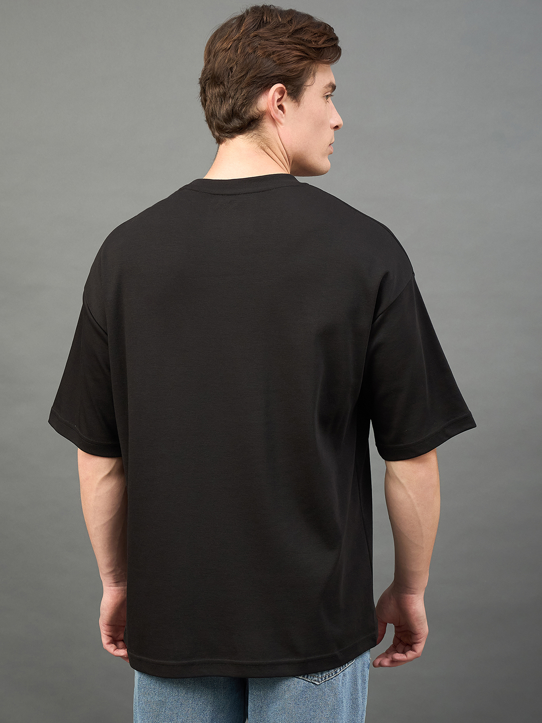 Men Solid Black Bordered Beige Half Sleeve Round Neck T Shirt