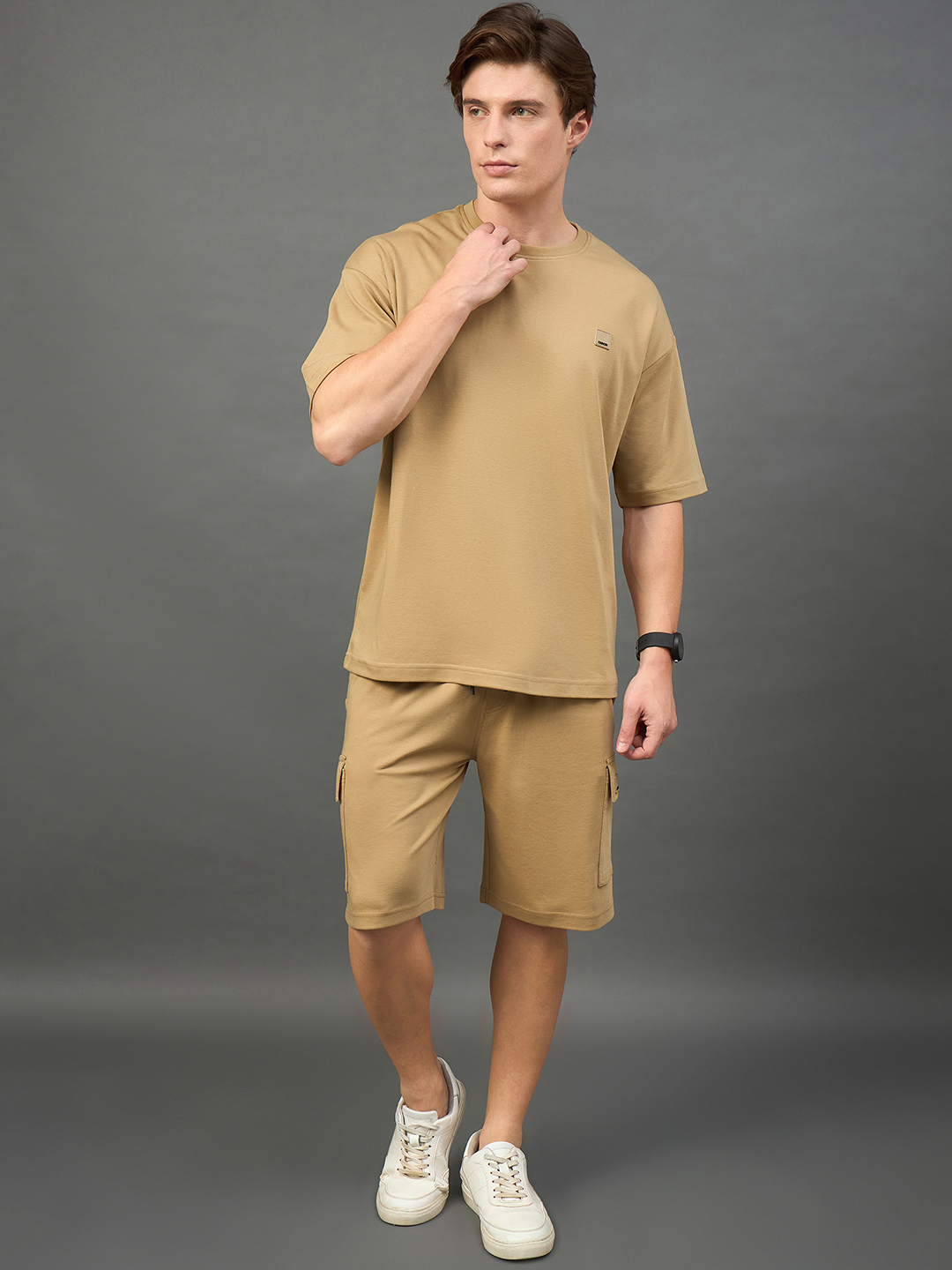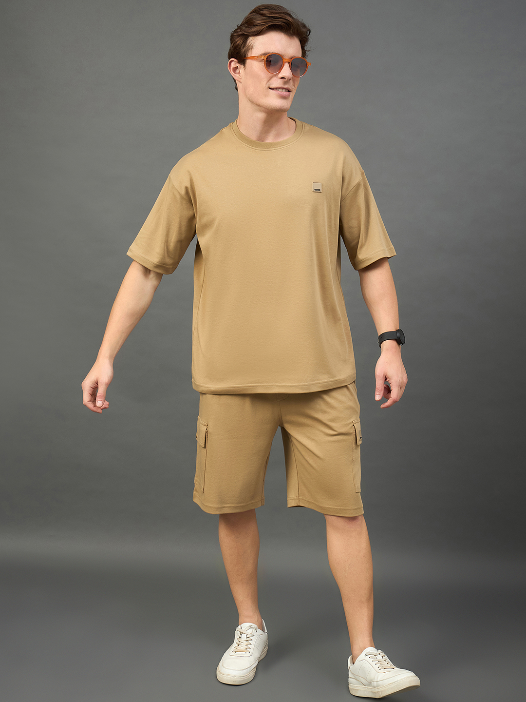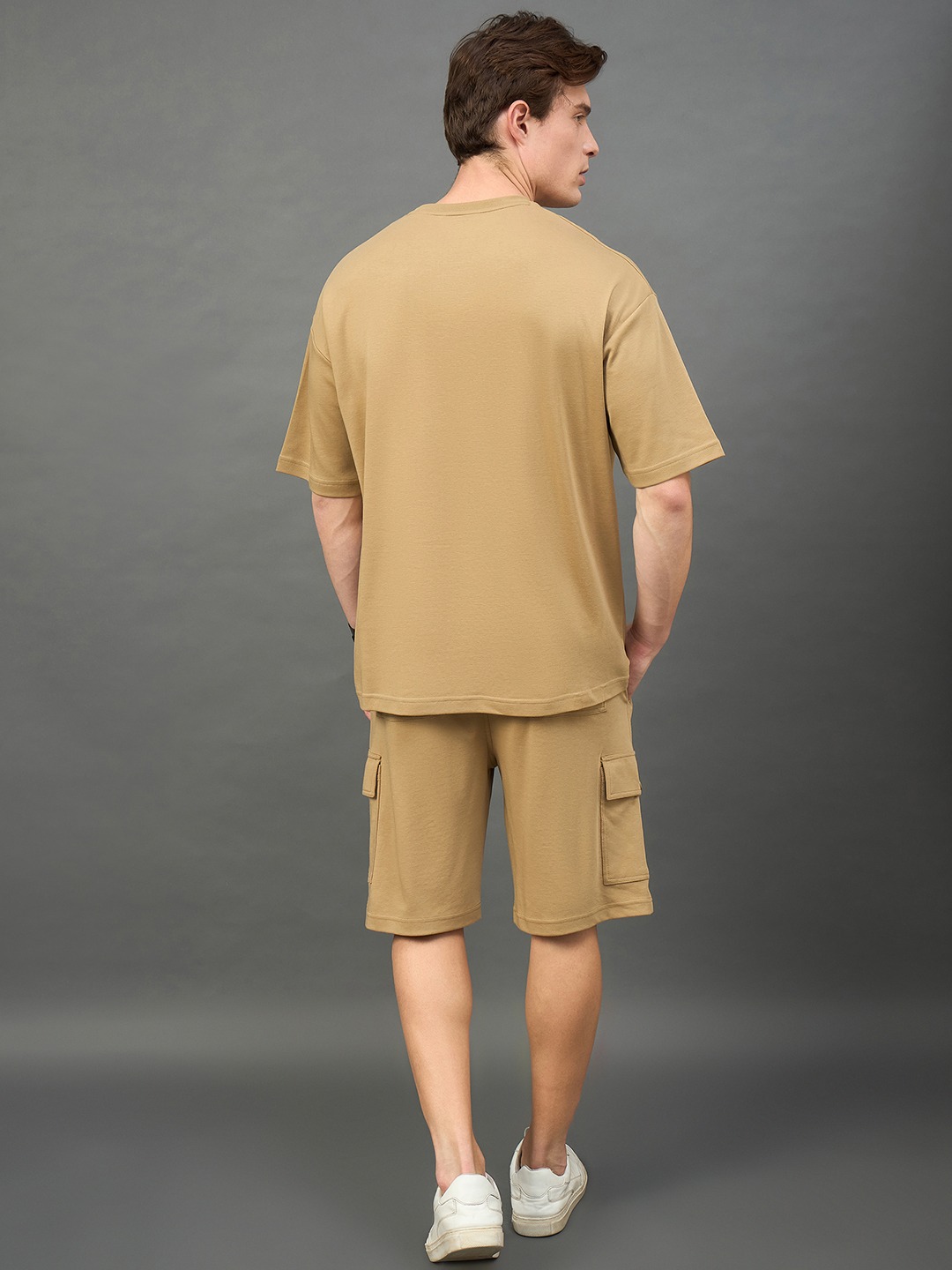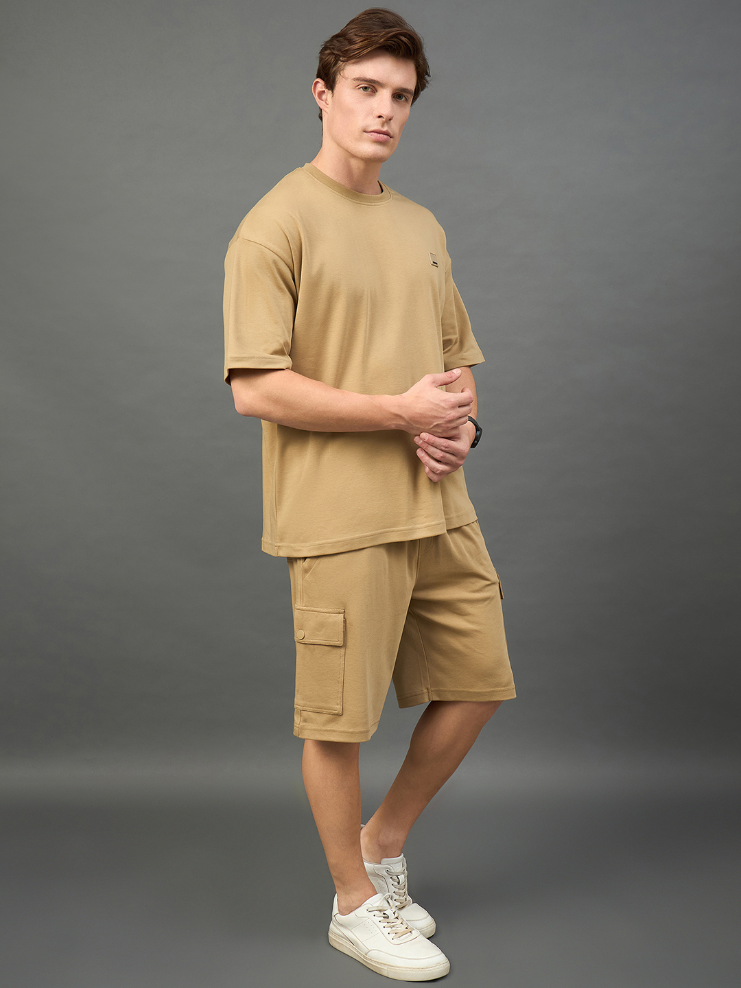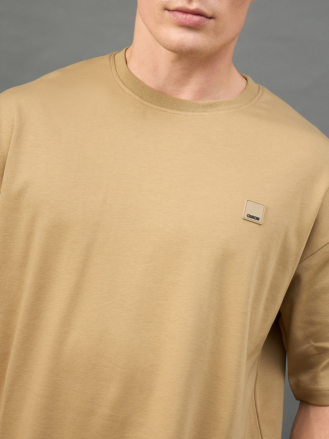 Men Solid Light Brown Round Neck Oversized T Shirt