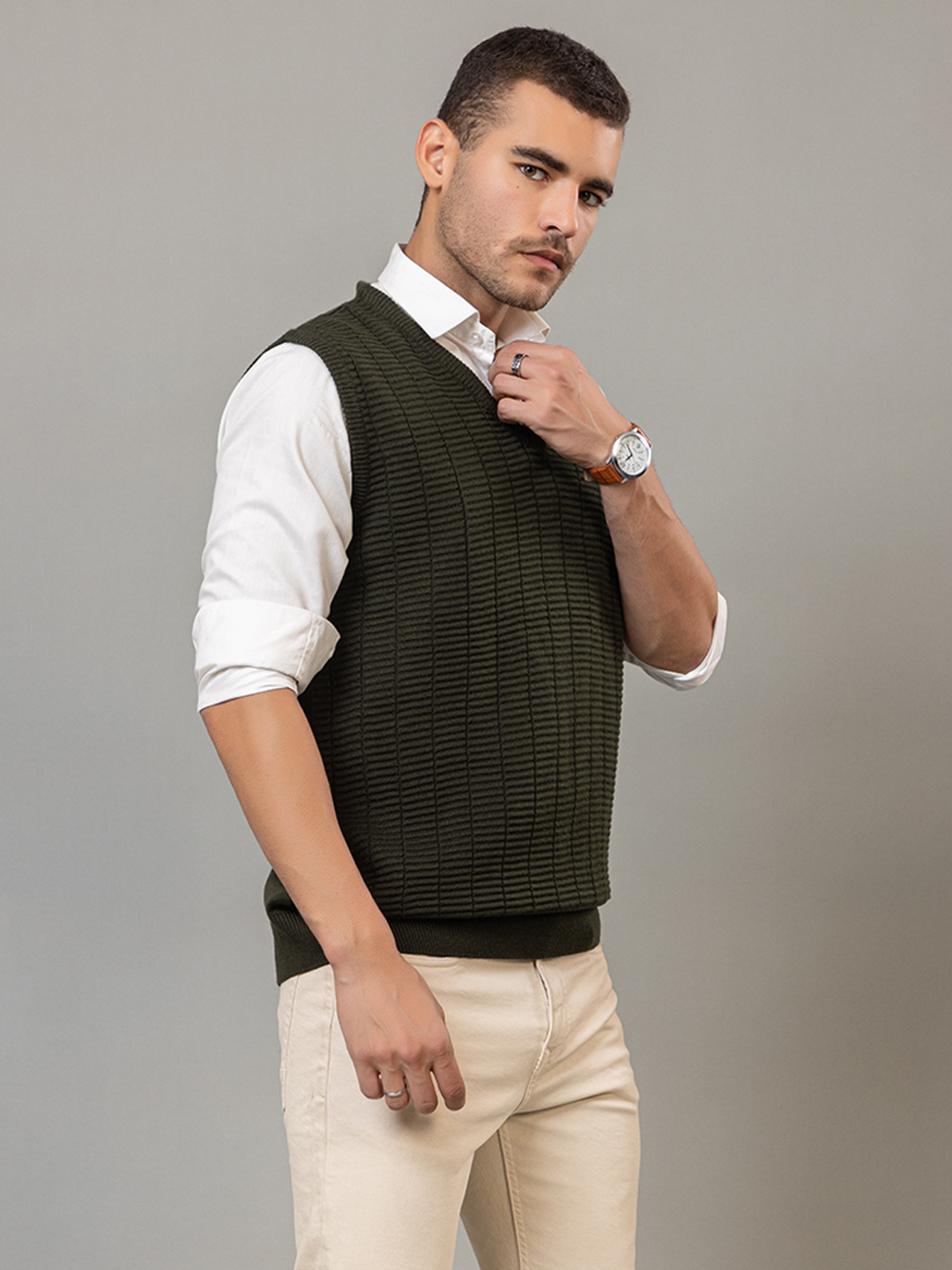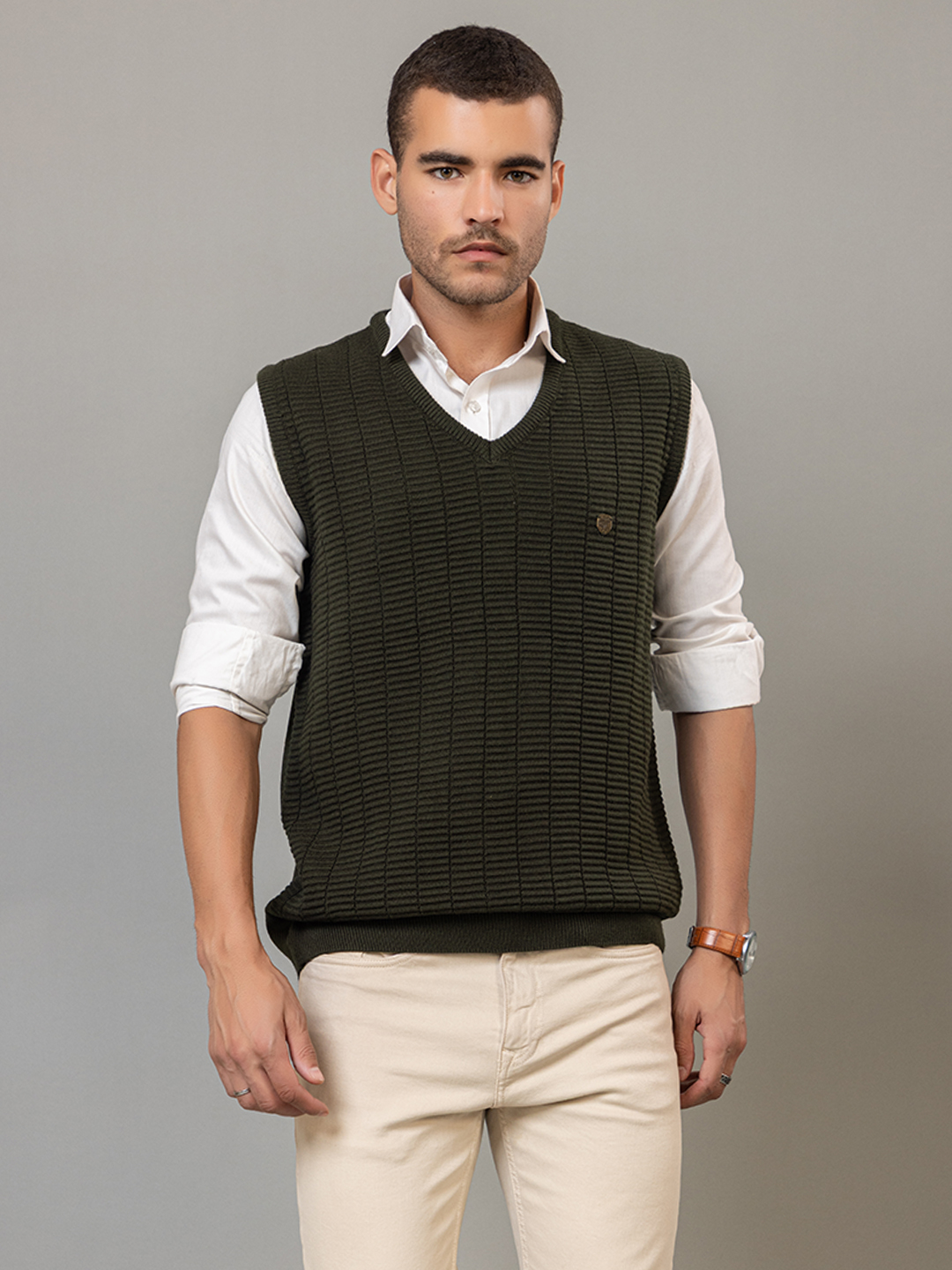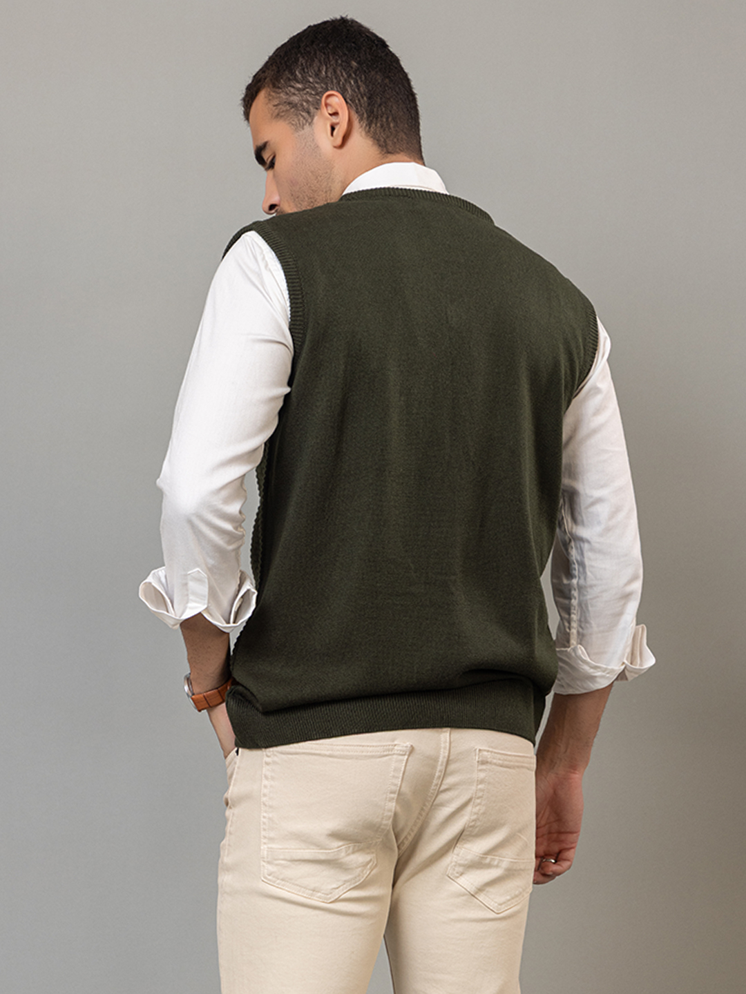 Olive Sleeveless Solid V Neck Sweater 3493