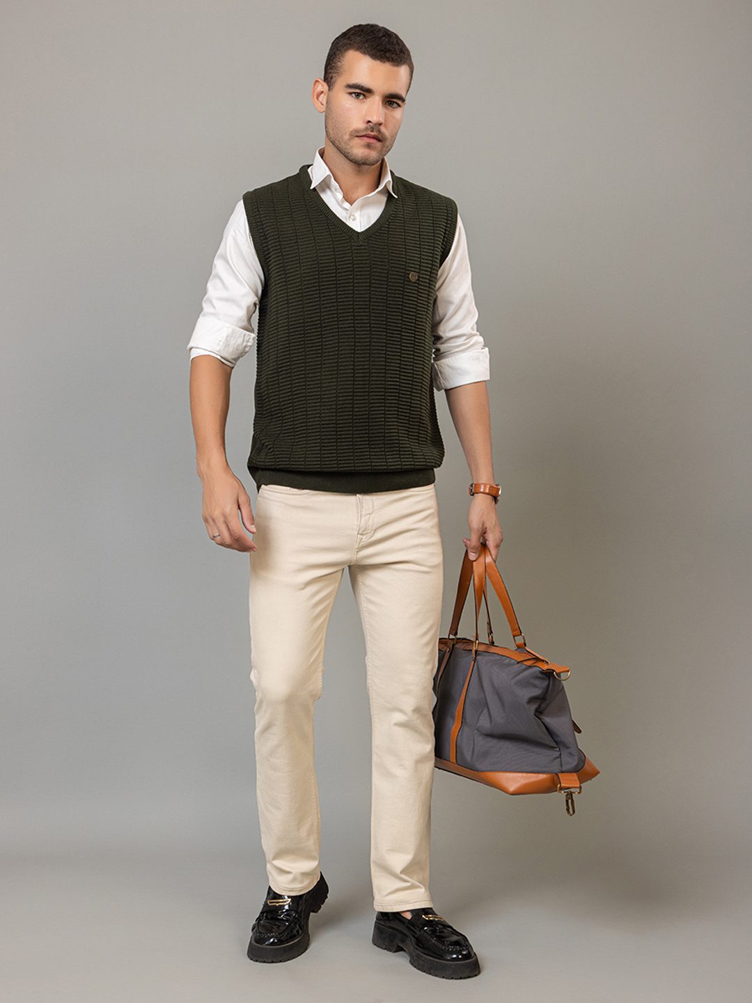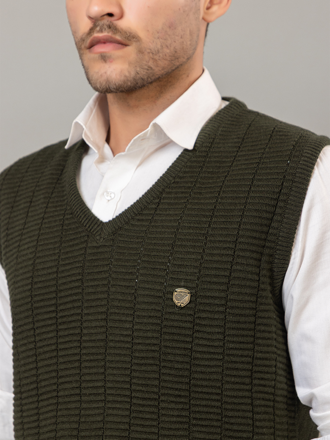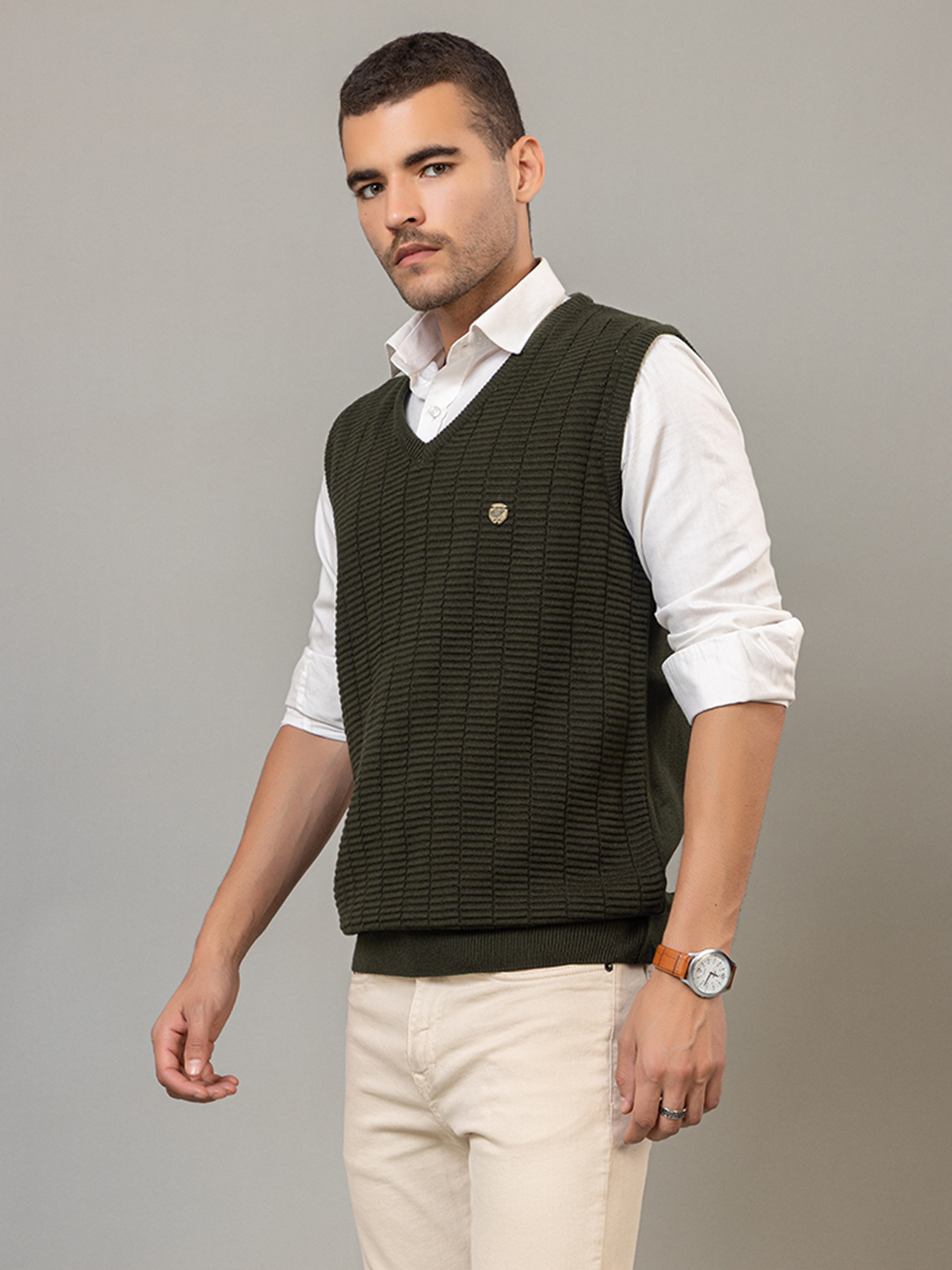 Olive Sleeveless Solid V Neck Sweater 3493