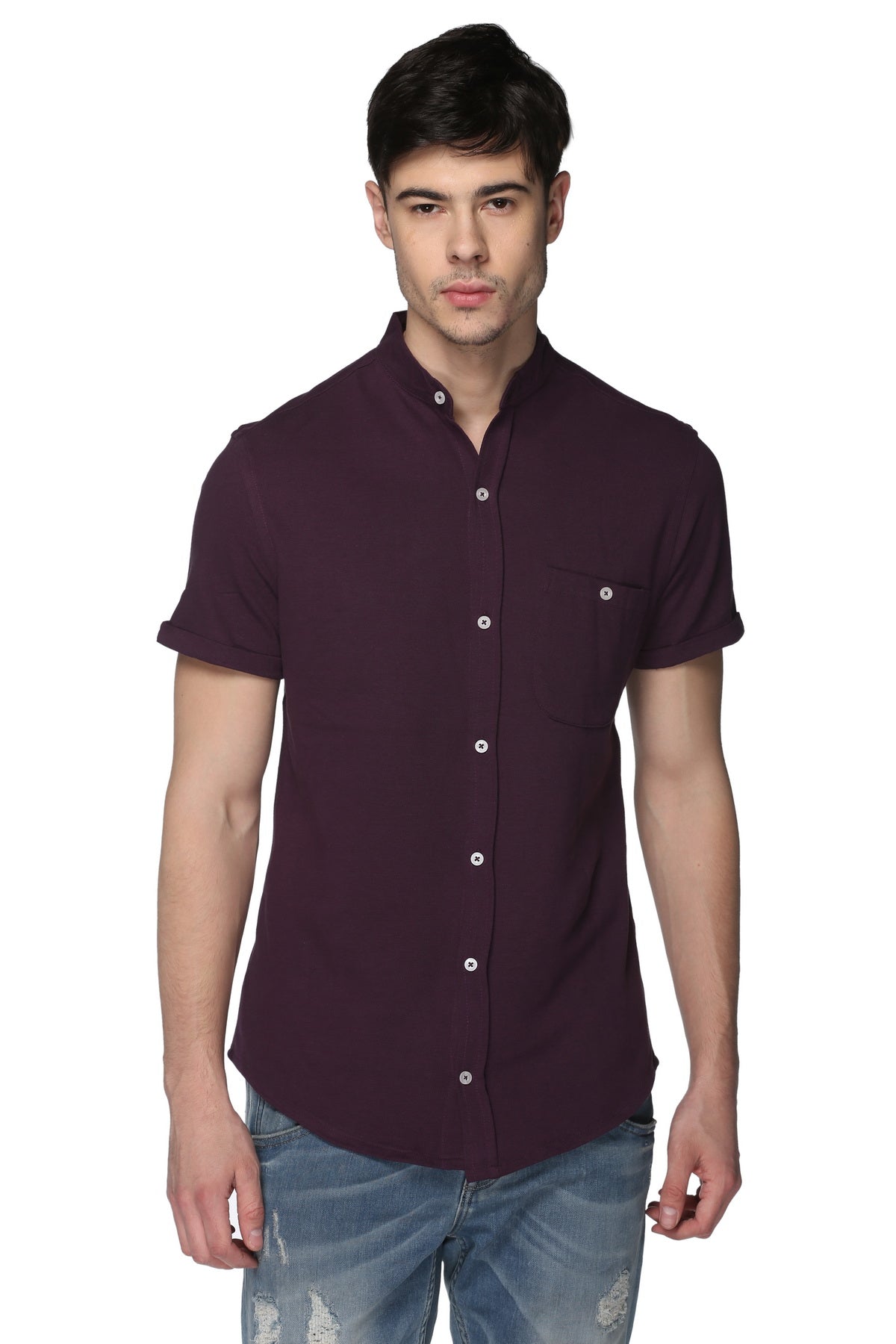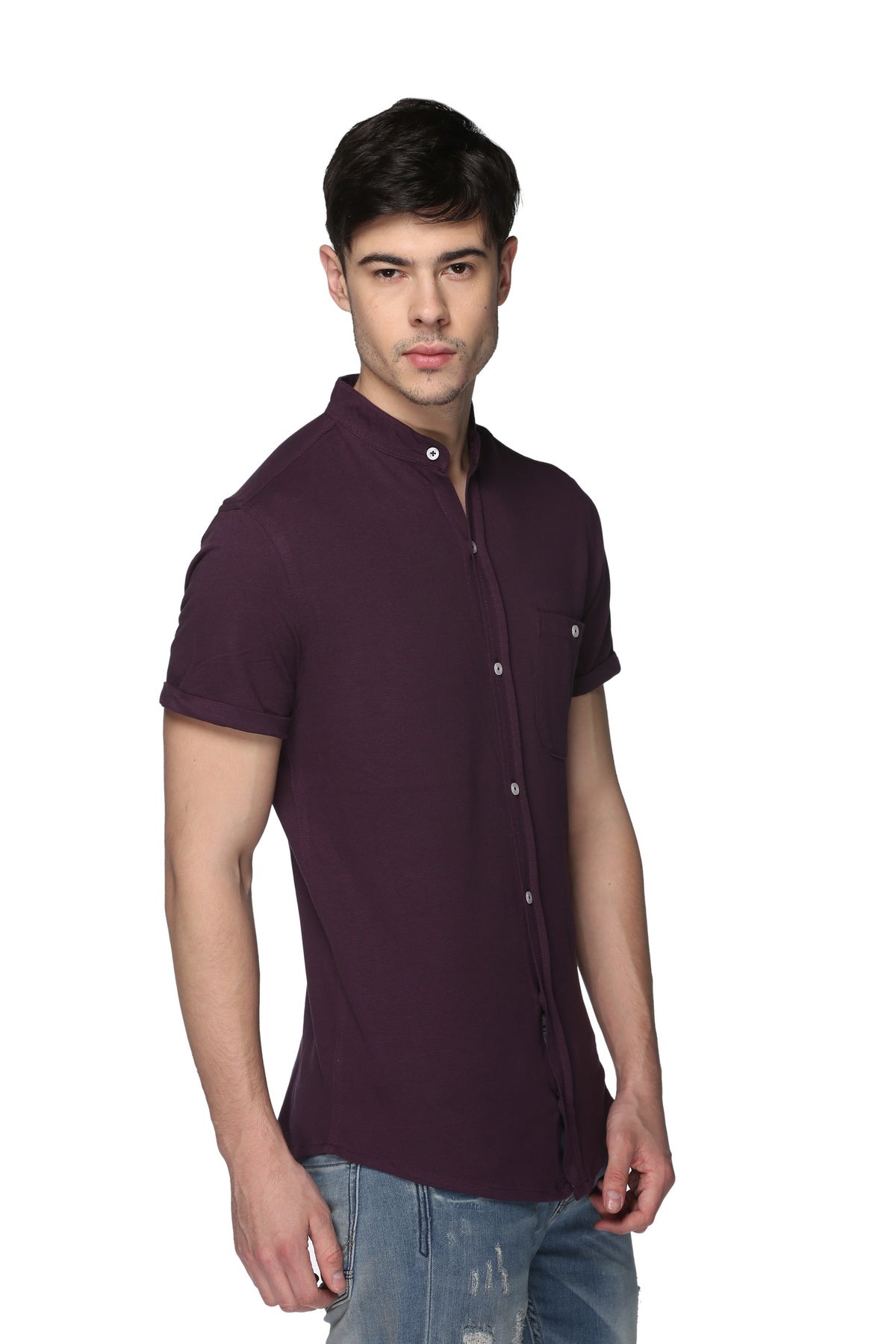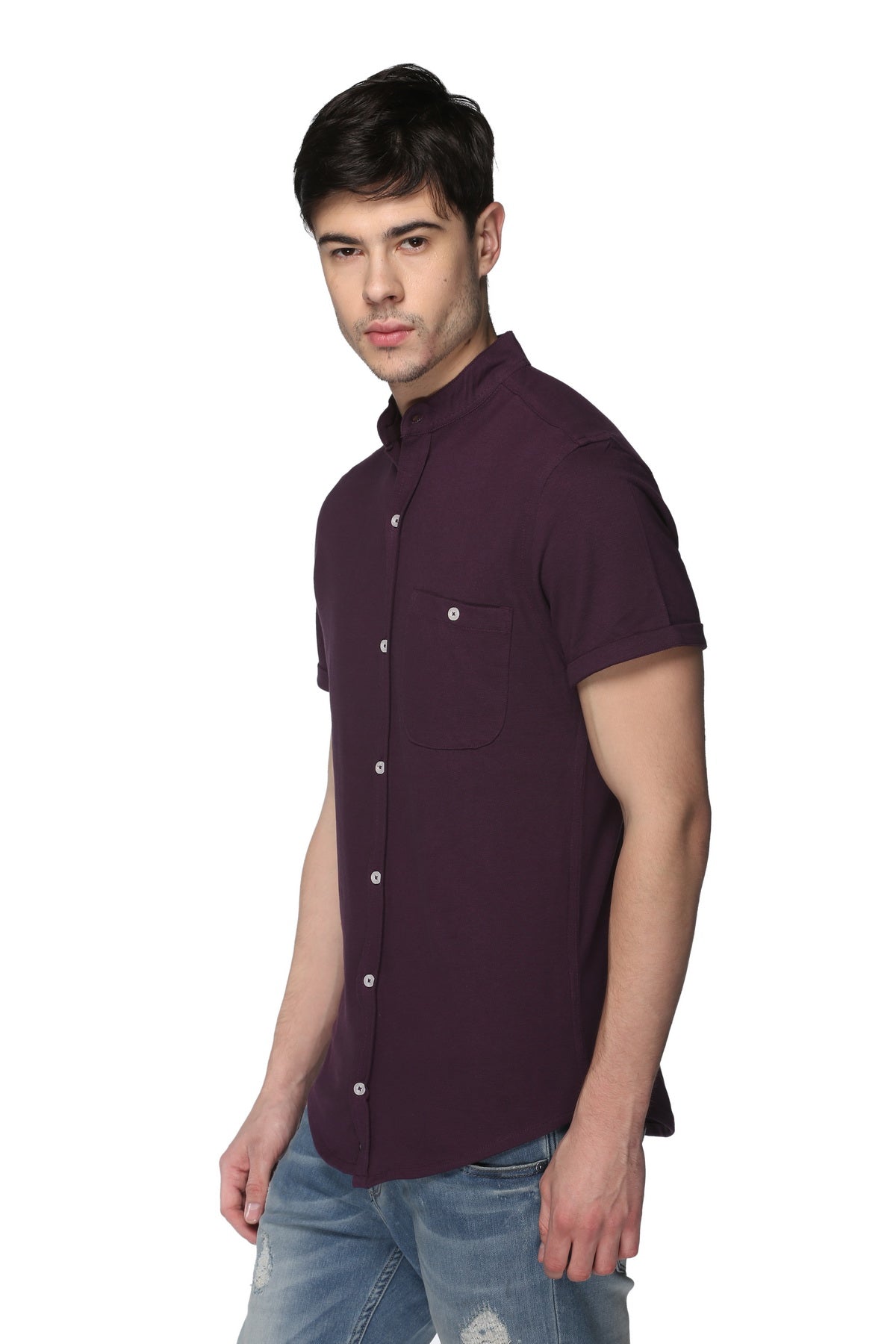 Purple Mandarin Knitted Shirt Has Chest Pocket Sm15 8040