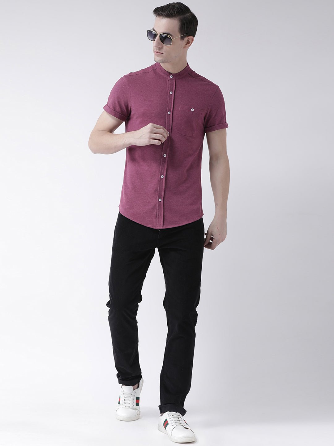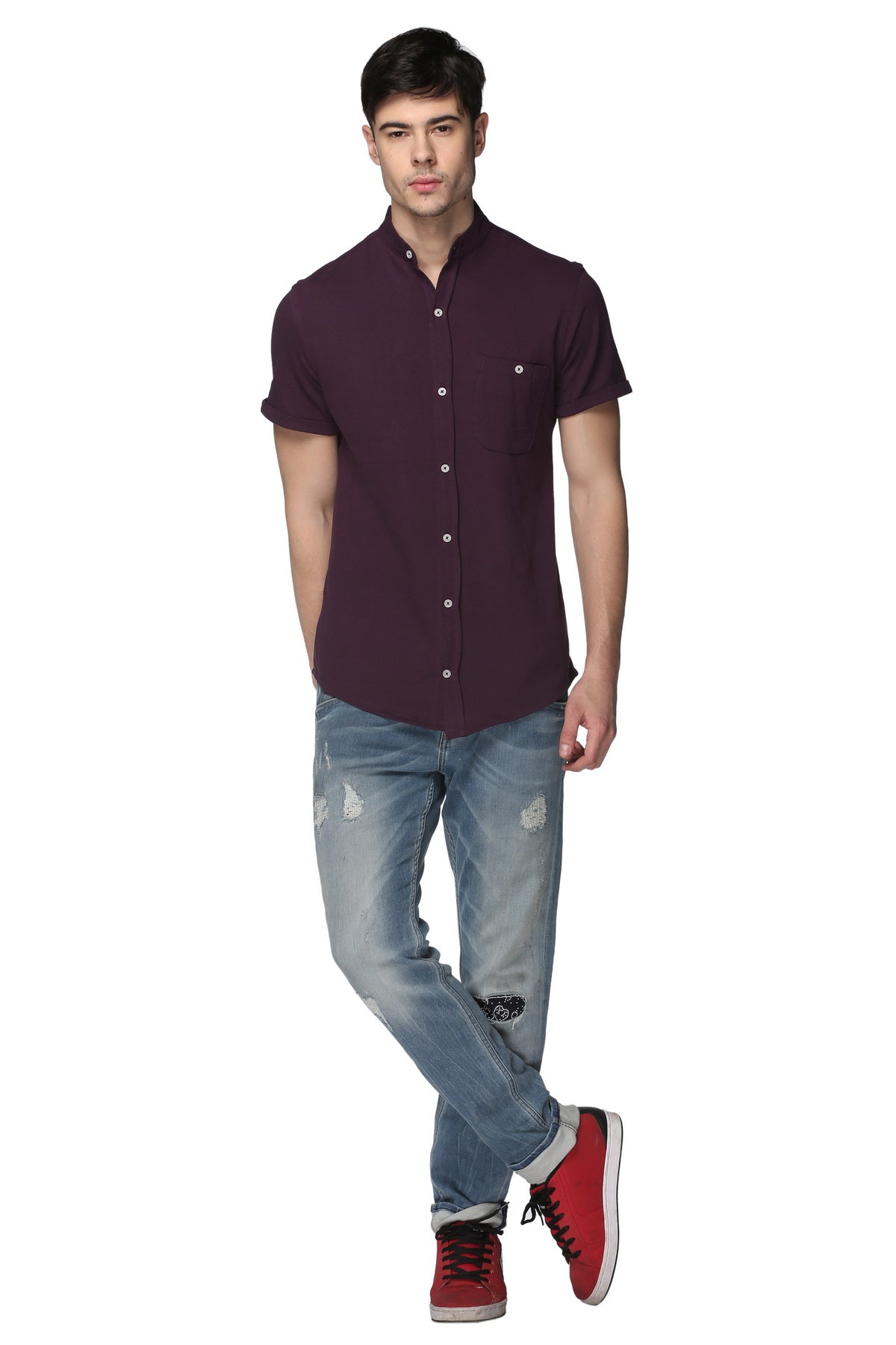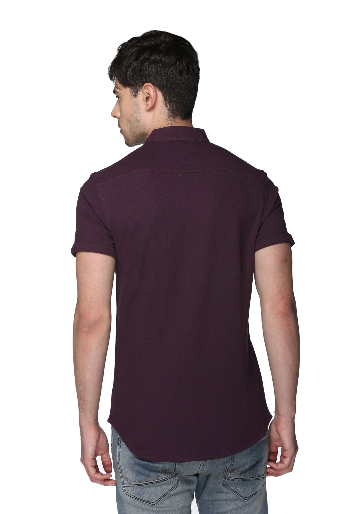 Purple Mandarin Knitted Shirt Has Chest Pocket Sm15 8040