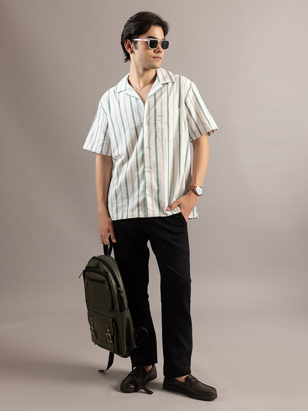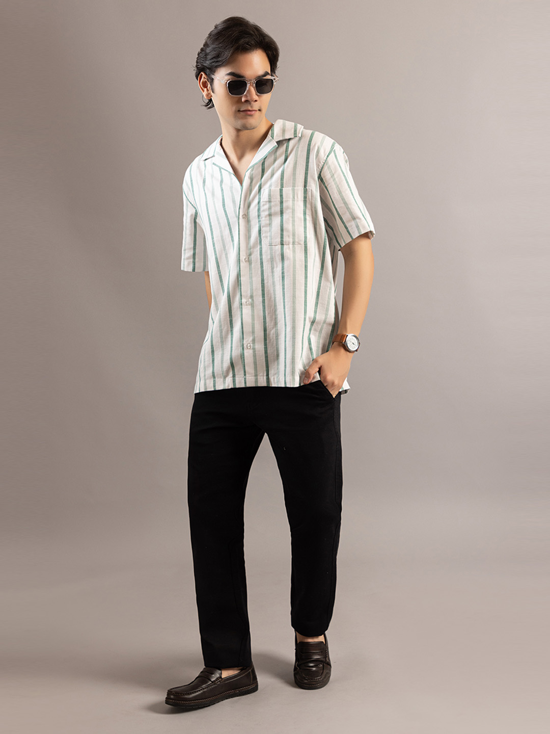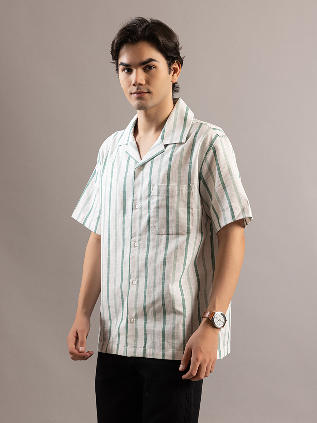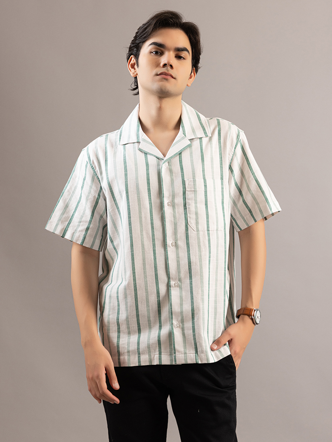 Stylish Striped Off White Greenish Half Sleeve Shirt