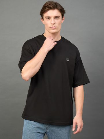 Men Solid Black Round Neck Oversized T Shirt